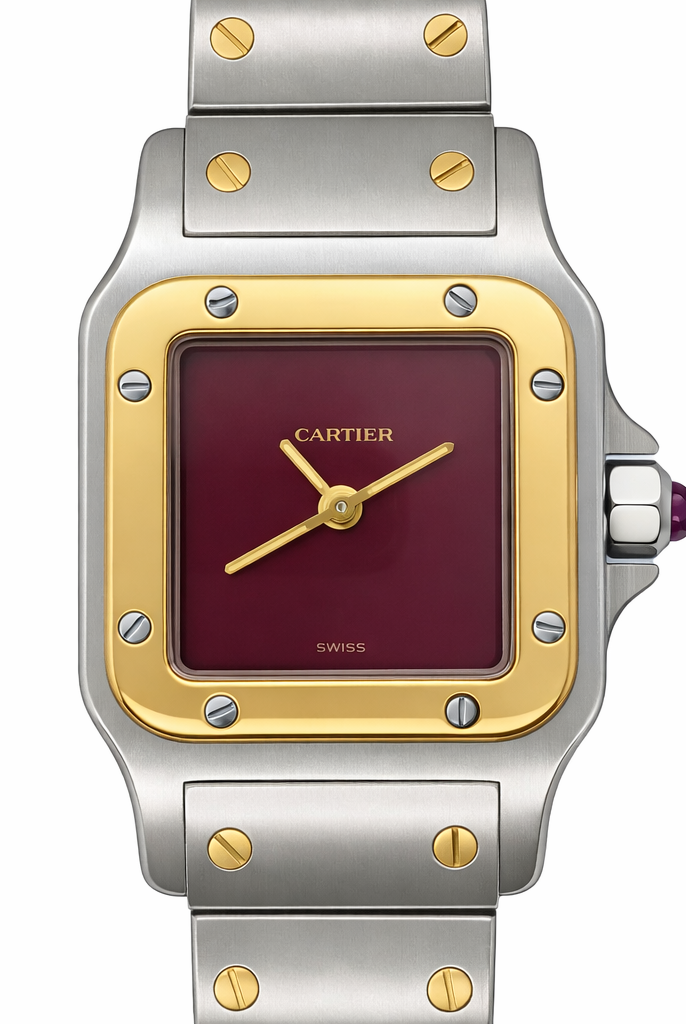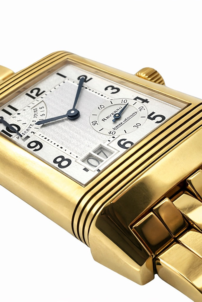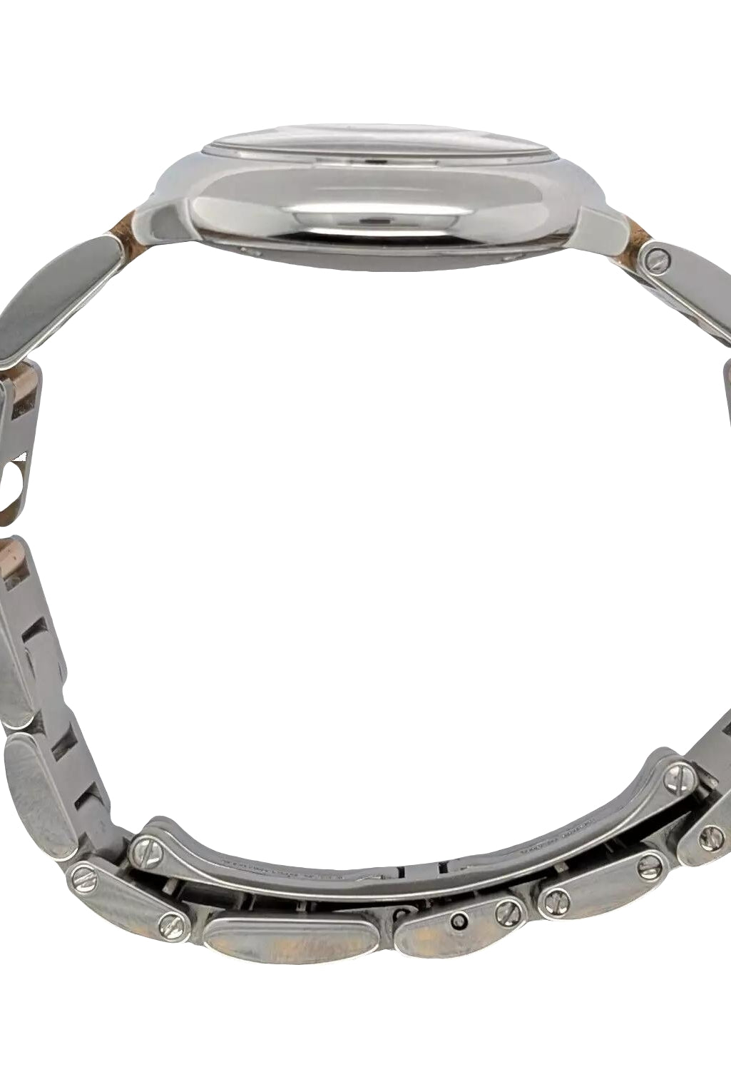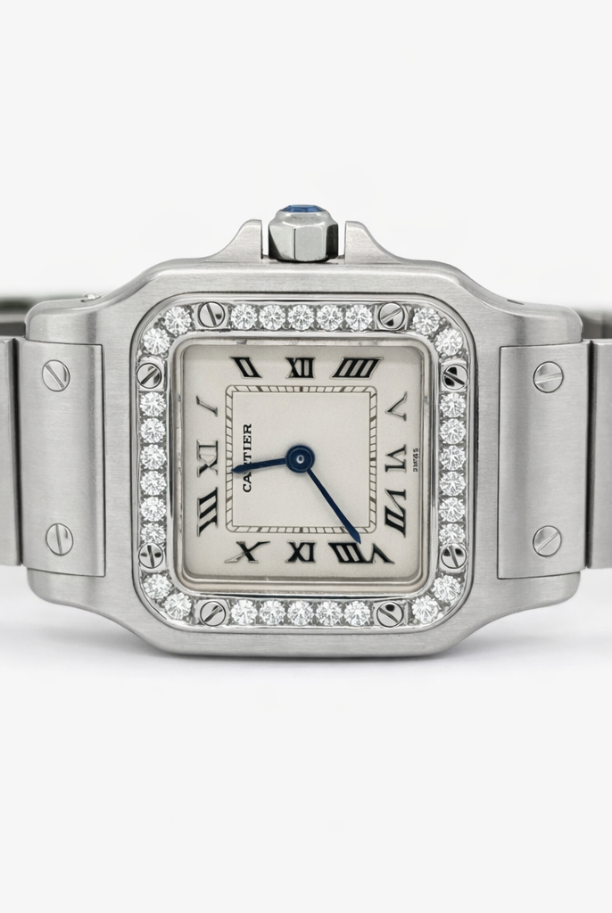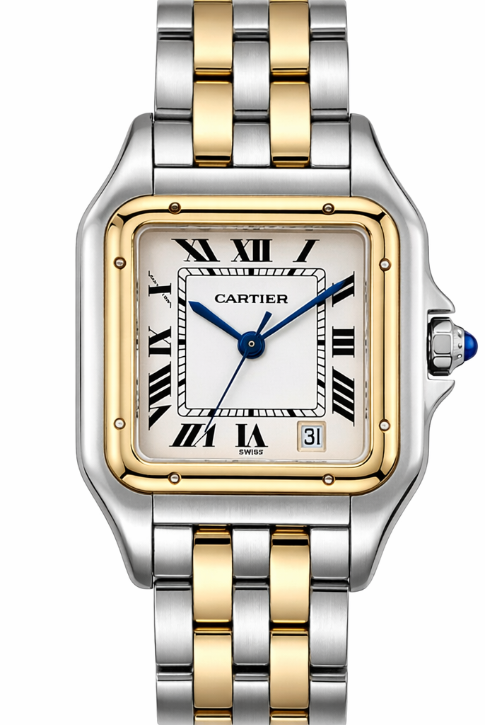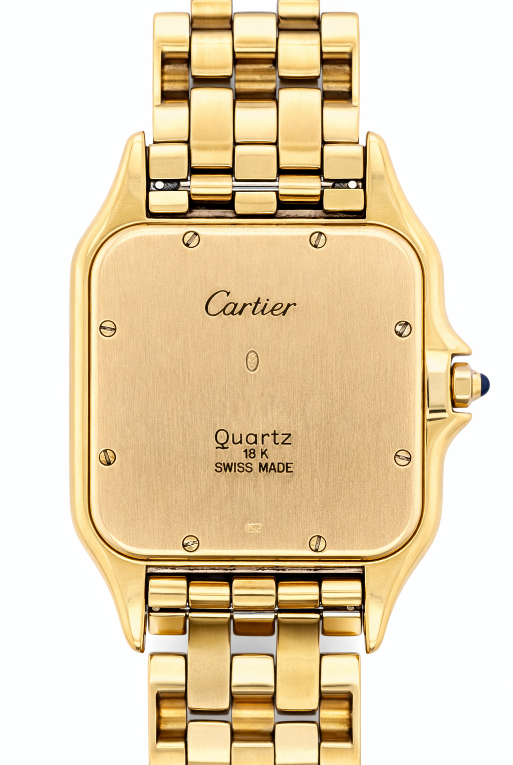 Crafted entirely from 18ct yellow gold, the watch features a crisp white dial with Cartier’s signature Roman numerals, blued steel hands, and a secret “Cartier” signature hidden within the VII numeral — a subtle detail authenticating its luxury pedigree. The solid gold linked bracelet is fluid and comfortable, designed to contour perfectly to the wrist while offering unmistakable presence.