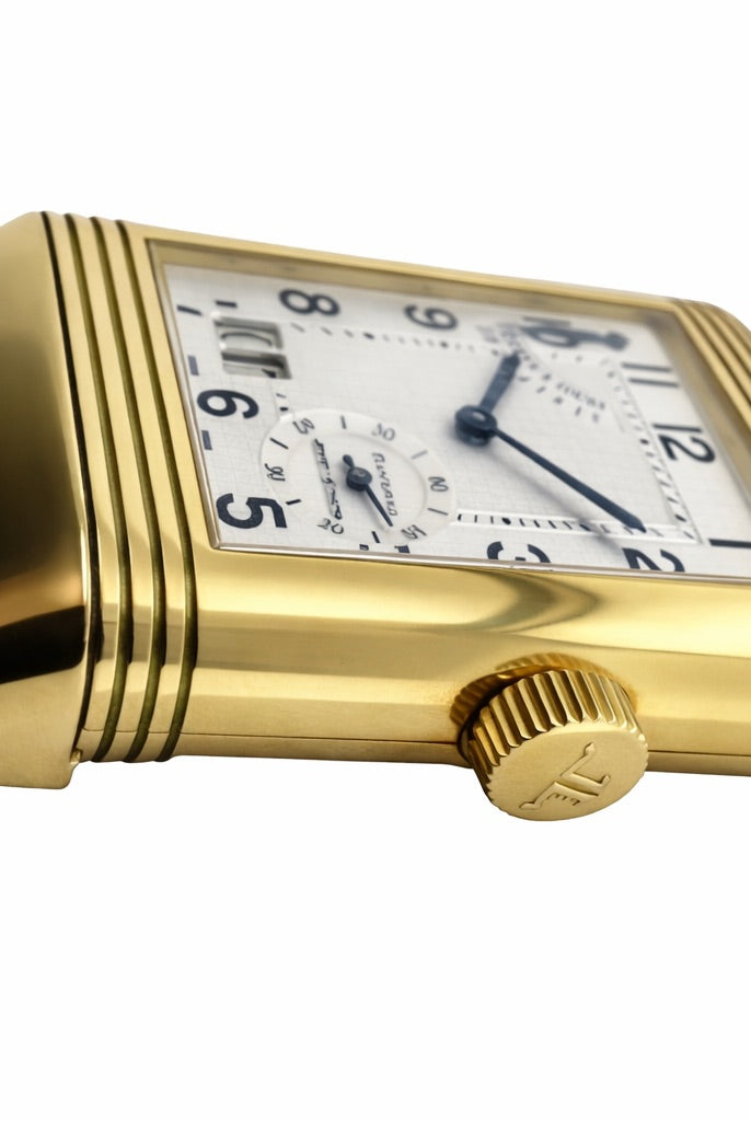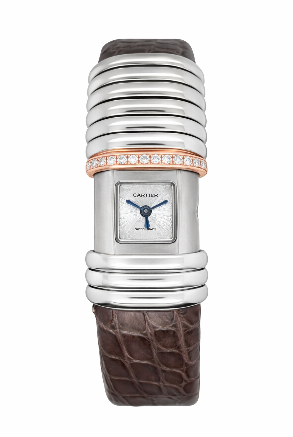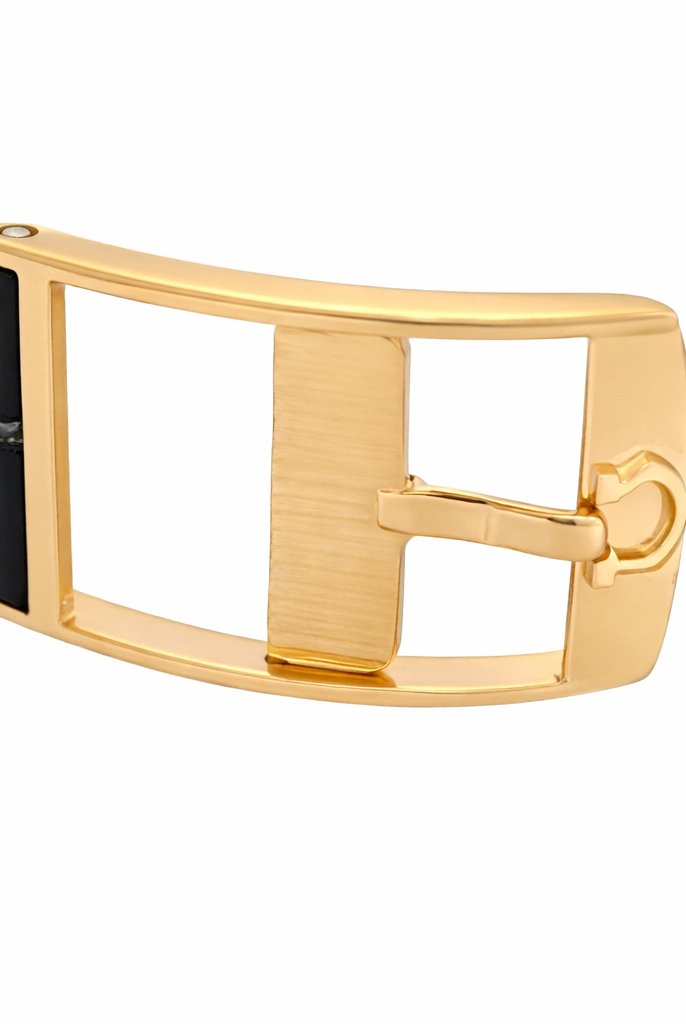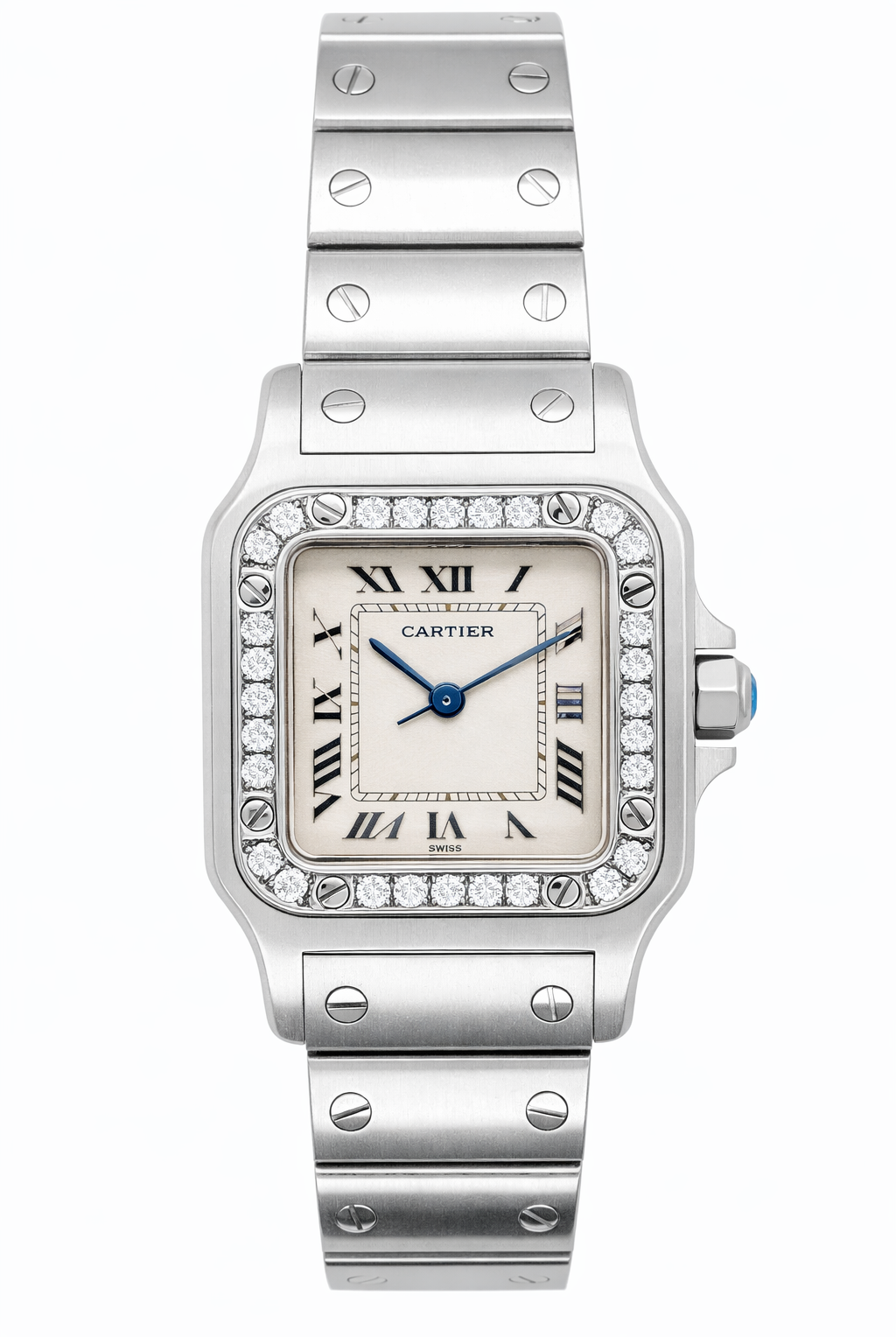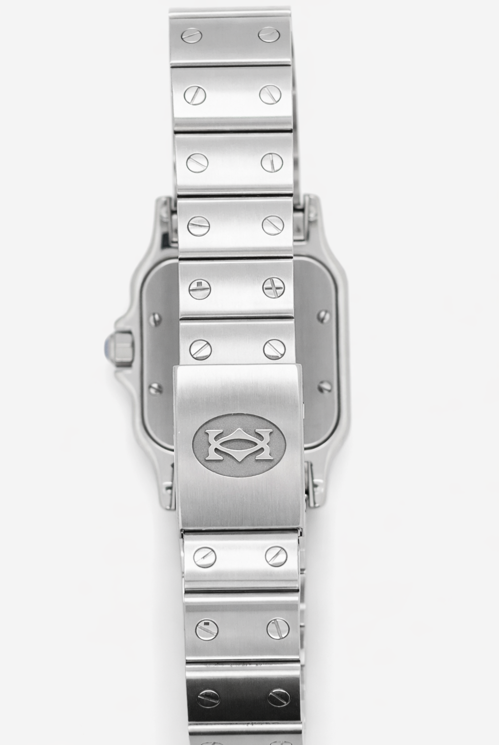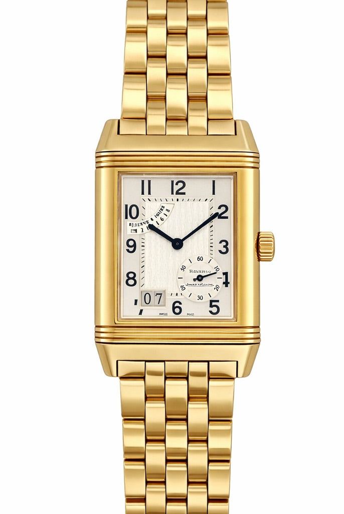 Crafted entirely from 18ct yellow gold, the watch features a crisp white dial with Cartier’s signature Roman numerals, blued steel hands, and a secret “Cartier” signature hidden within the VII numeral — a subtle detail authenticating its luxury pedigree. The solid gold linked bracelet is fluid and comfortable, designed to contour perfectly to the wrist while offering unmistakable presence.