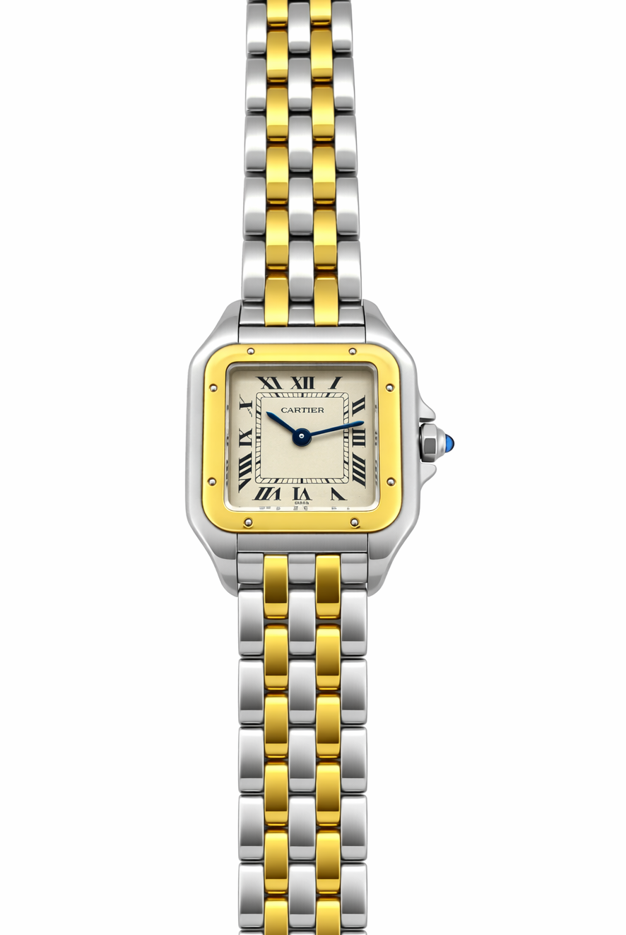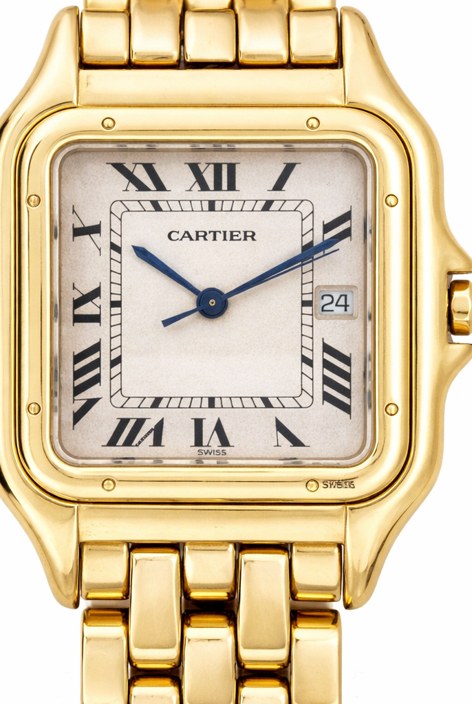 Bold, timeless, and effortlessly refined, this Cartier Panthère watch in solid 18ct yellow gold is a rare and iconic piece that reflects the pinnacle of Cartier’s design heritage. With its distinctive square case and seamless link bracelet, the Panthère is one of Cartier’s most recognisable and admired creations — and this full gold version makes a confident statement of taste and success.