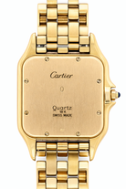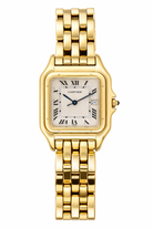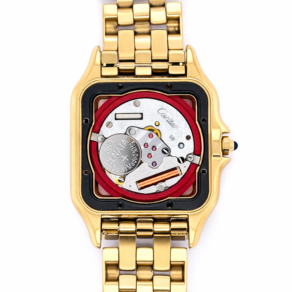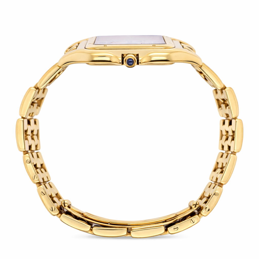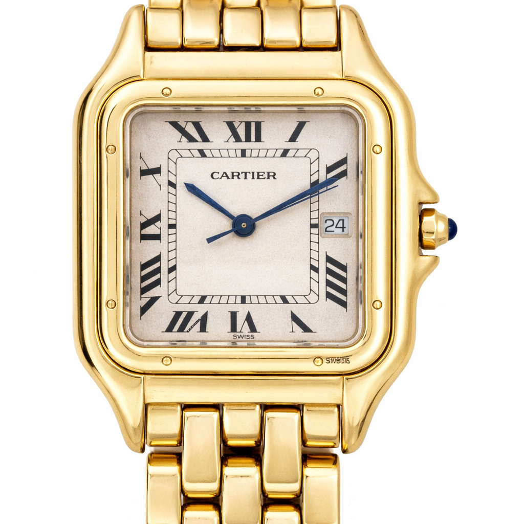 Bold, timeless, and effortlessly refined, this Cartier Panthère watch in solid 18ct yellow gold is a rare and iconic piece that reflects the pinnacle of Cartier’s design heritage. With its distinctive square case and seamless link bracelet, the Panthère is one of Cartier’s most recognisable and admired creations — and this full gold version makes a confident statement of taste and success.