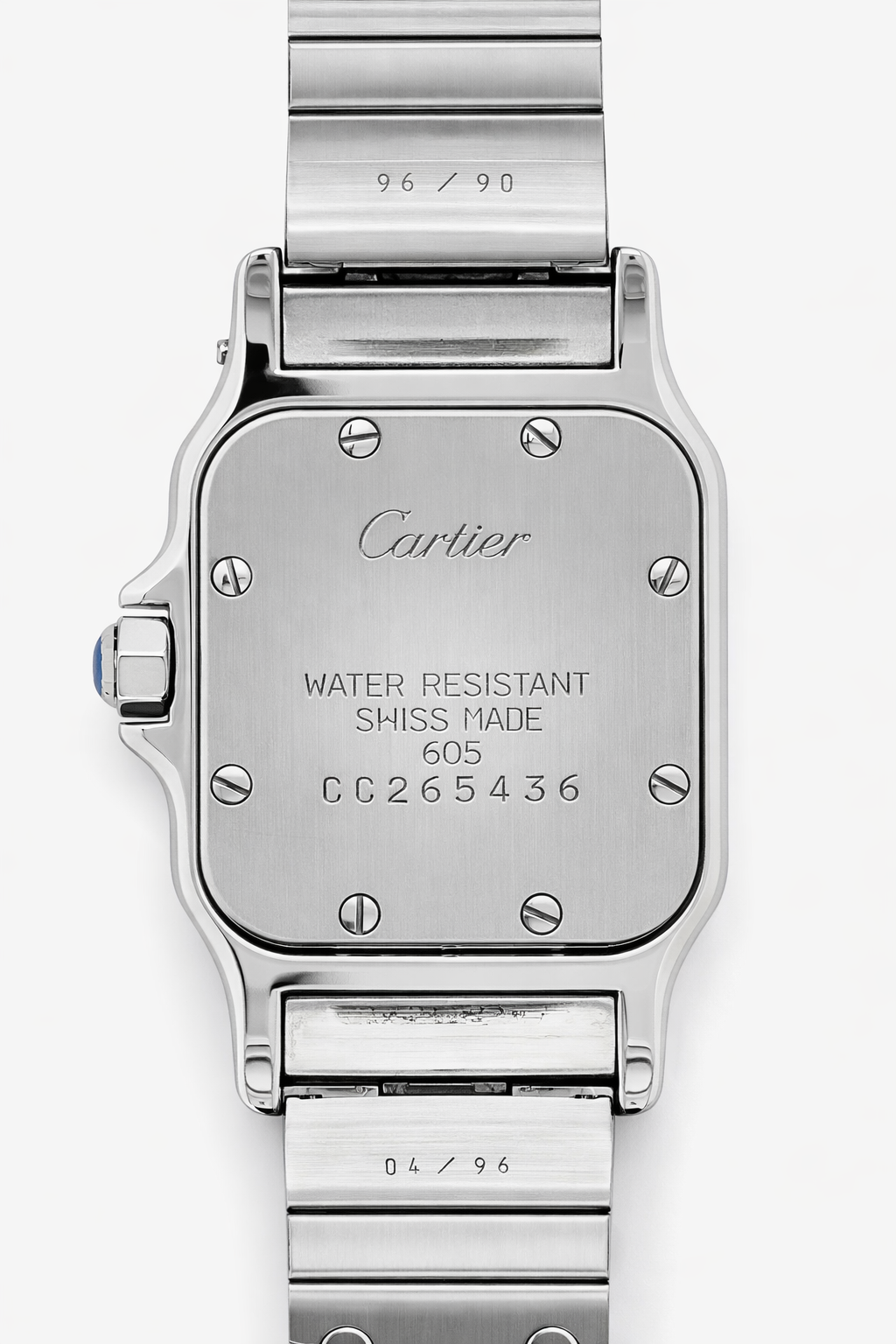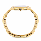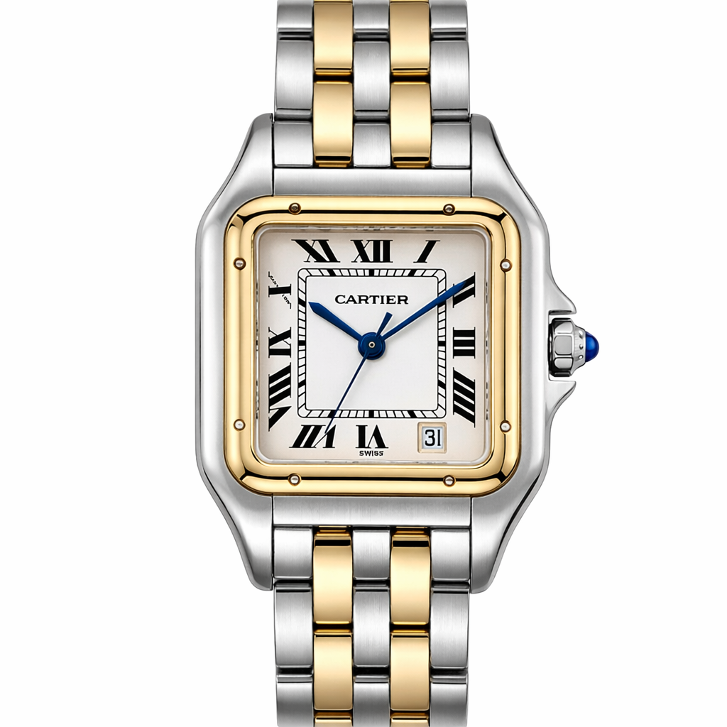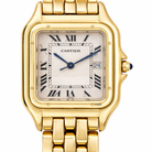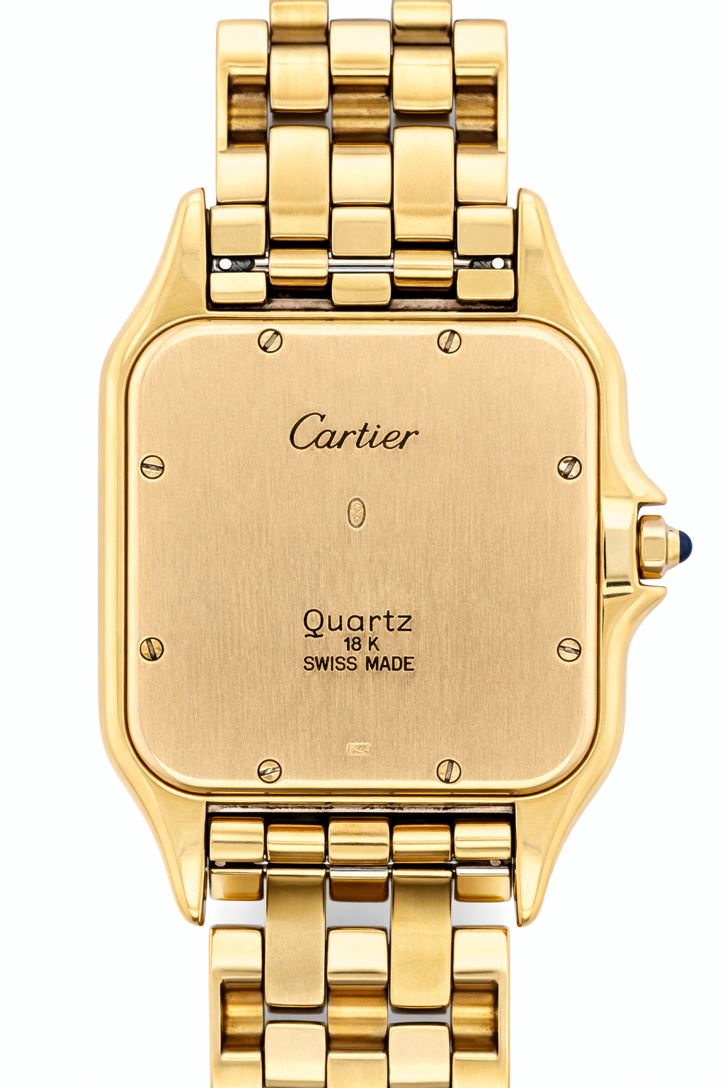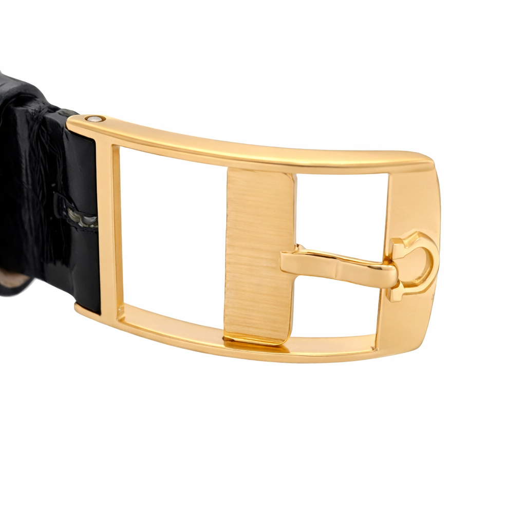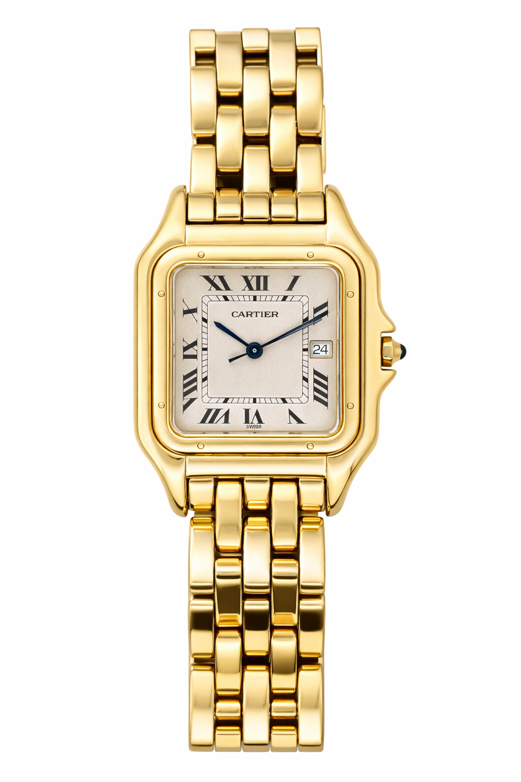 Crafted entirely from 18ct yellow gold, the watch features a crisp white dial with Cartier’s signature Roman numerals, blued steel hands, and a secret “Cartier” signature hidden within the VII numeral — a subtle detail authenticating its luxury pedigree. The solid gold linked bracelet is fluid and comfortable, designed to contour perfectly to the wrist while offering unmistakable presence.