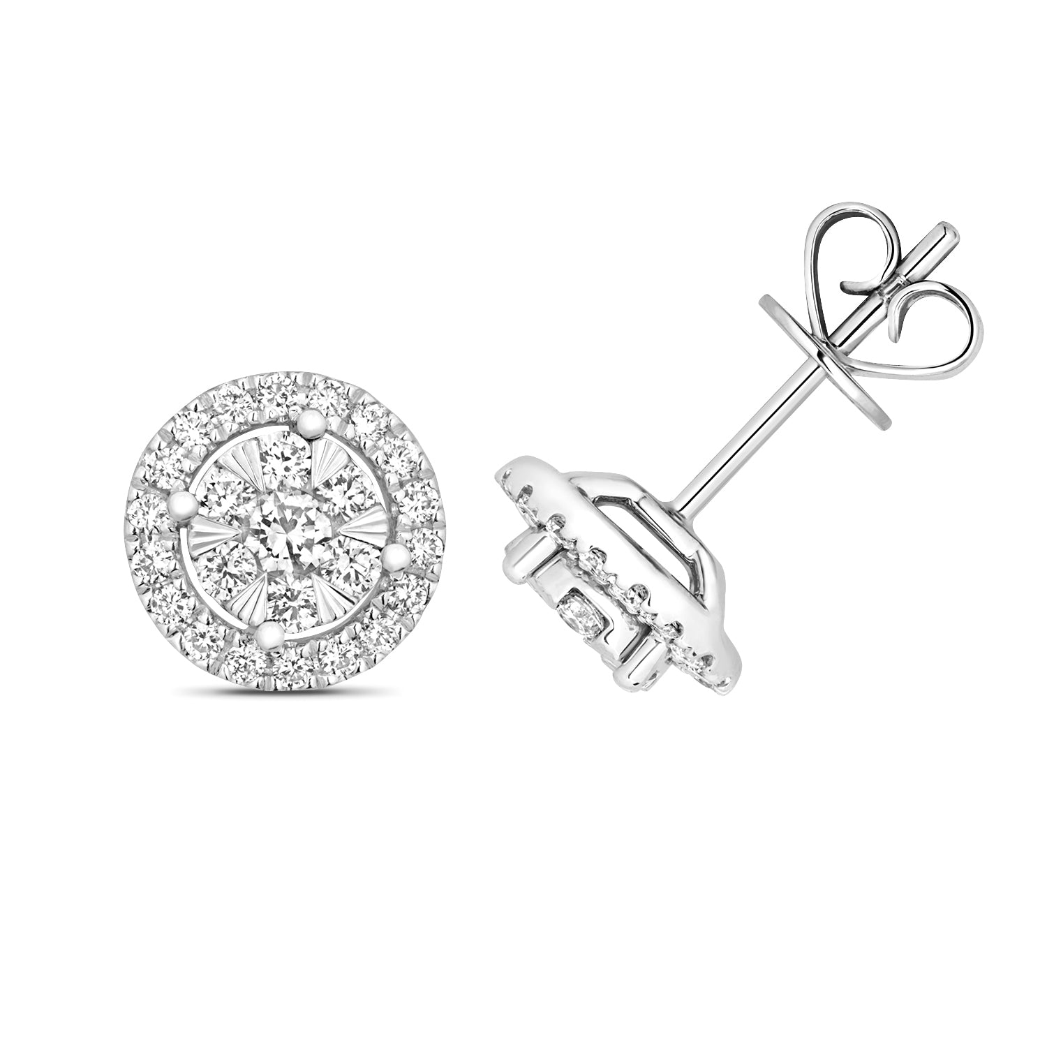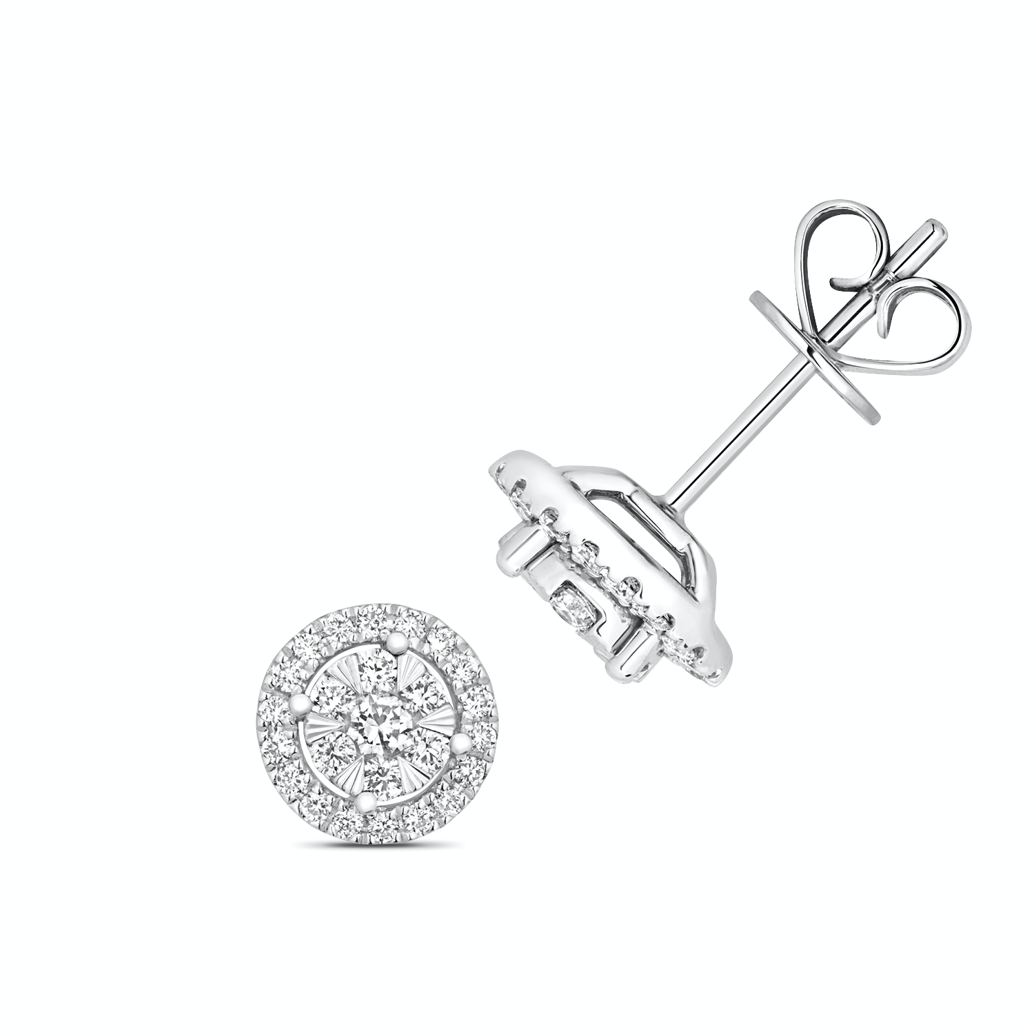 Illuminate your look with the radiant elegance of our cluster studs, each adorned with a dazzling halo of Diamonds. Each stud features a stunning cluster of seven round brilliant-cut Diamonds, surrounded by a halo of smaller Diamonds, creating an exquisite and eye-catching design. The stones, with a total weight of 0.55carats, possess a G colour and SI1 clarity, offering exceptional brilliance and sparkle. Crafted from luxurious 18ct white Gold, these studs are a sophisticated and timeless addition to any jewellery collection.