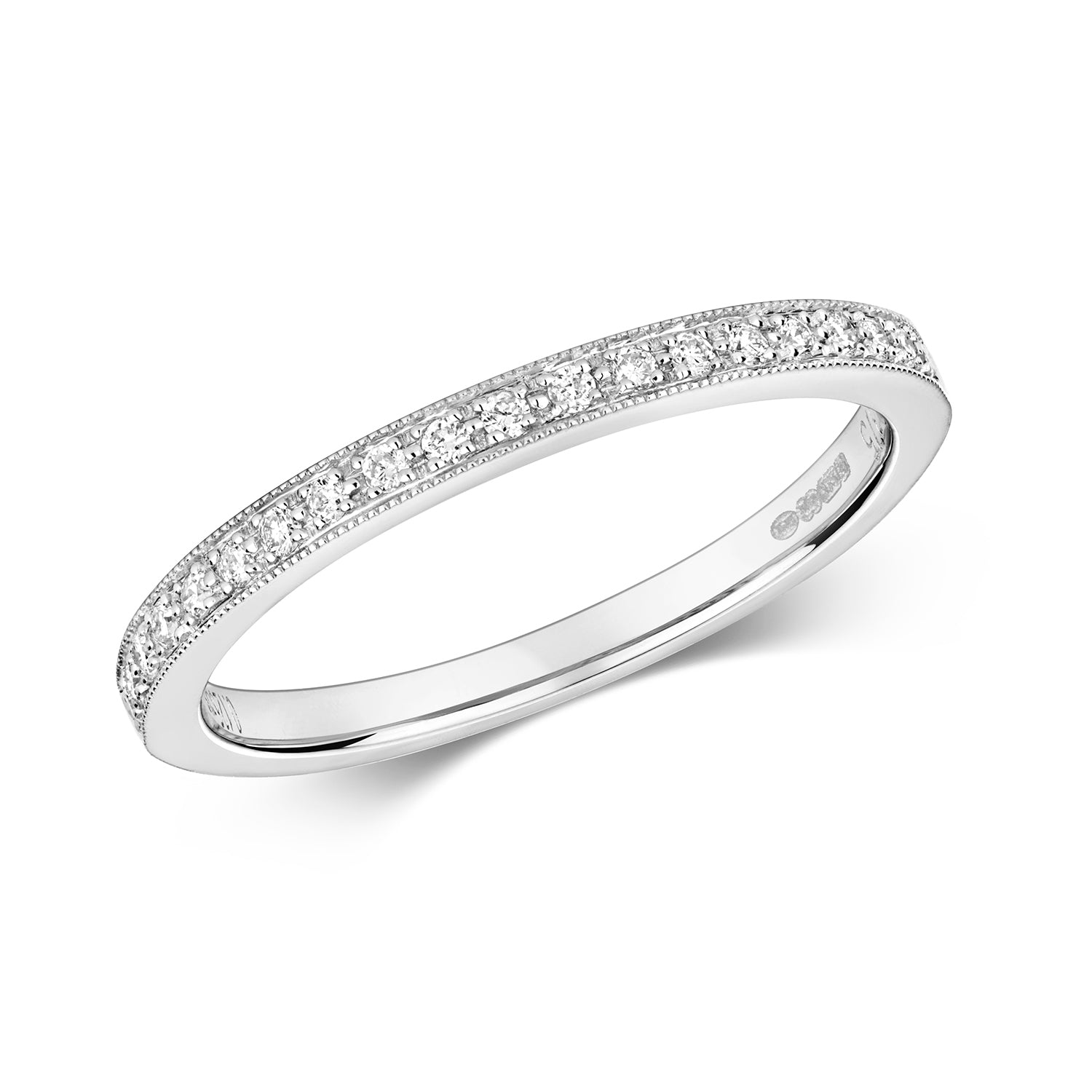 Weighing 2 grams, this ring is lightweight and comfortable to wear, ensuring it can be enjoyed daily without any inconvenience. The milgrain edge not only enhances the ring's aesthetic appeal but also provides a tactile element that adds to its uniqueness. Whether it's a symbol of love, a milestone celebration, or simply an elegant accessory, this half eternity ring is a beautiful choice that exudes grace and sophistication.