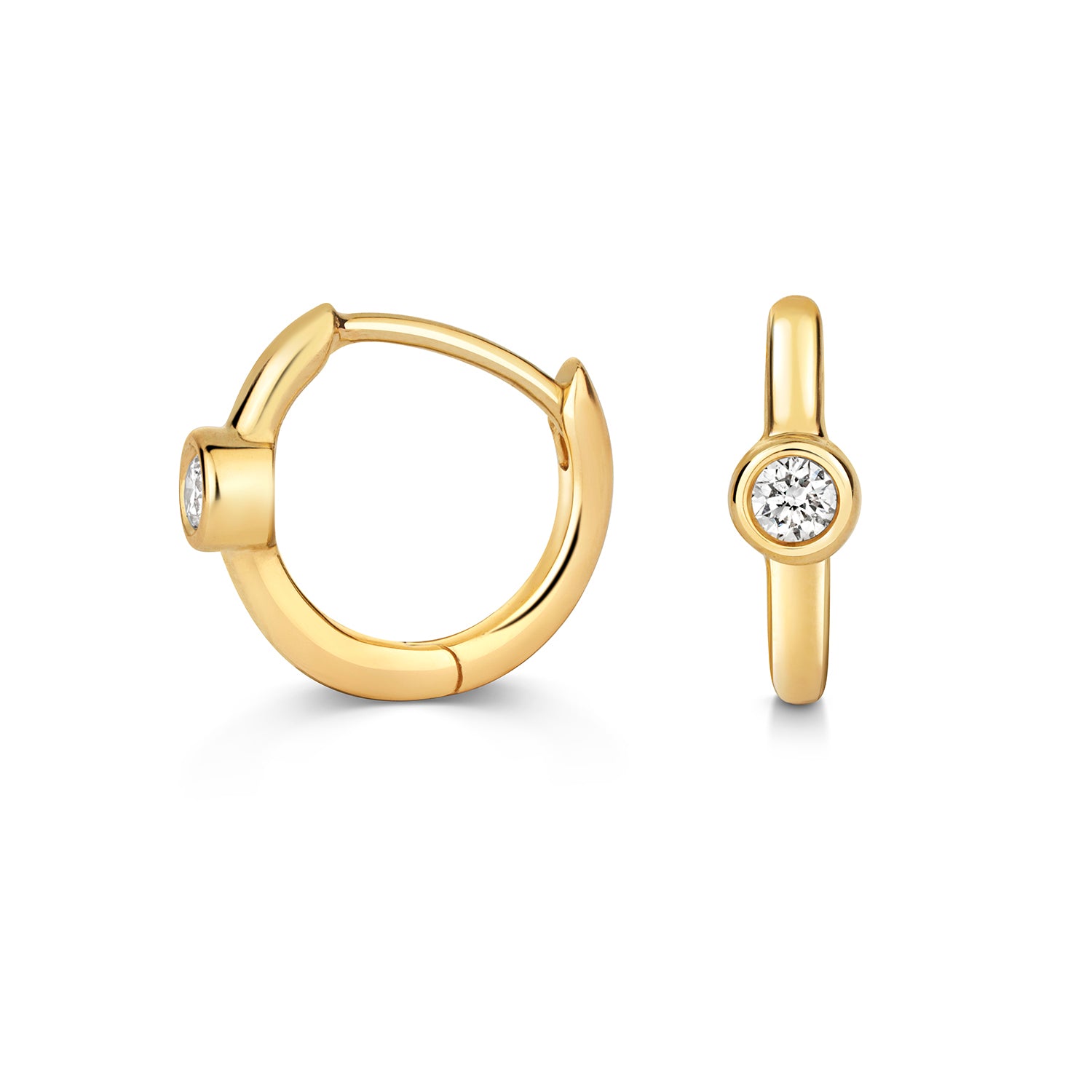 Introducing our exquisite pair of Gold huggie earrings, designed for understated elegance. Each huggie features a brilliant-cut Diamond held securely in place by a sleek bezel setting, adding a touch of sparkle to your style. Crafted from radiant 9ct Gold, these huggies boast a single Diamond of H colour and I1 clarity, with a total carat weight of 0.08ct, offering subtle yet captivating shimmer.