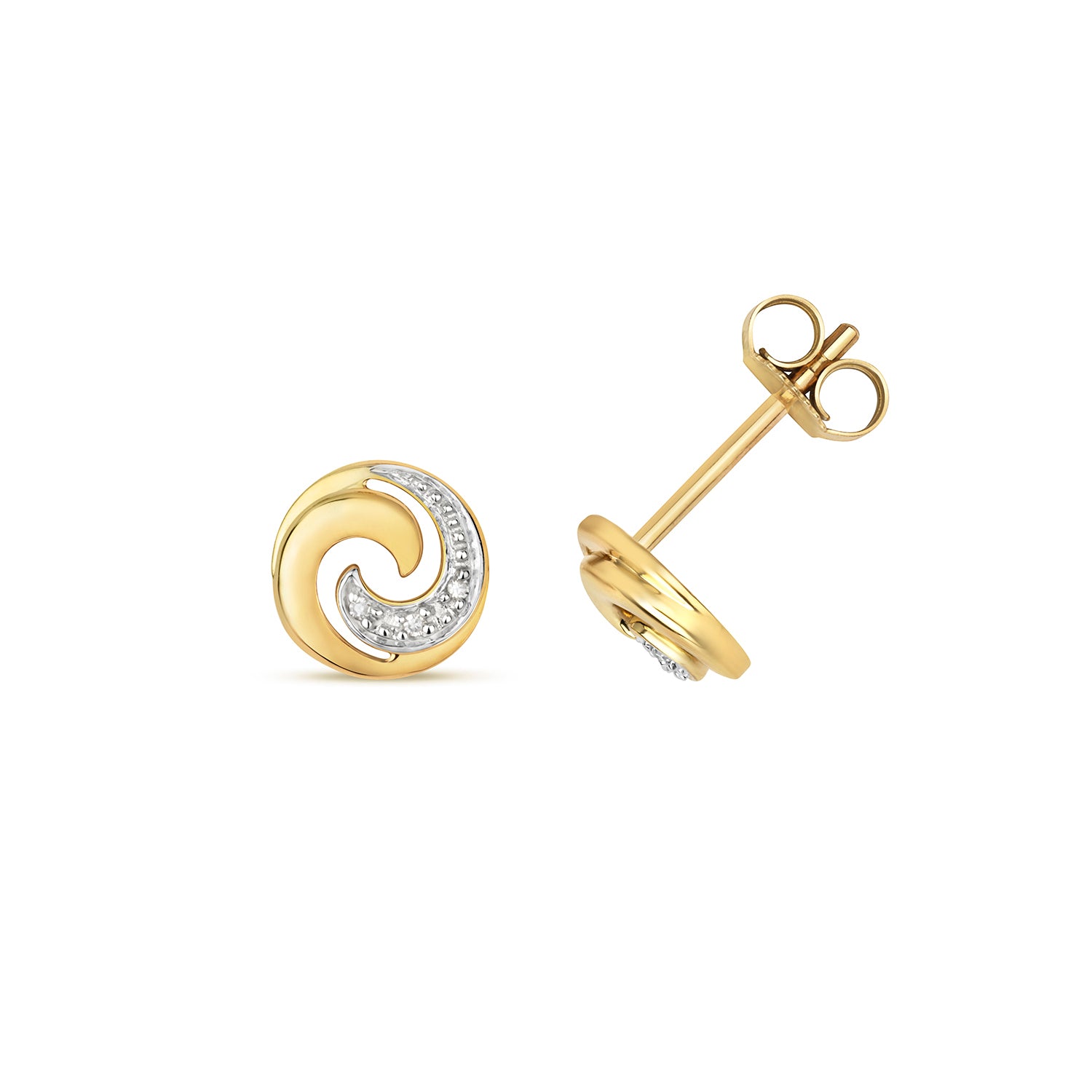 Introducing our elegant 9ct Gold Diamond stud earrings, featuring a captivating swirl design adorned with brilliant-cut Diamonds. The Diamonds are expertly graduated in size, adding a touch of sophistication and sparkle. Weighing 1.1 grams, these earrings are lightweight and comfortable for everyday wear. Secured with heart-shaped scroll butterfly closures, they offer both charm and security. Perfect for adding a touch of elegance to any outfit, these swirl design Diamond studs are a timeless addition to your jewellery collection.