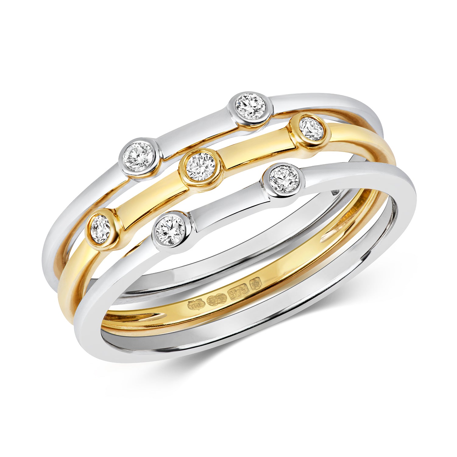 This exquisite 9ct yellow and white Gold 3 set ring is a perfect fusion of modern design and timeless elegance. The ring features three individual bands that seamlessly combine to create a unique and sophisticated piece. Each band is crafted from a mix of yellow and white Gold, providing a beautiful contrast that highlights the intricate design. Set with a total of seven brilliant-cut Diamonds, each Diamond is securely held in place by a bezel setting, ensuring maximum sparkle and a sleek, polished look. The Diamonds, graded H for colour, add a touch of brilliance and luxury, enhancing the ring's overall allure.