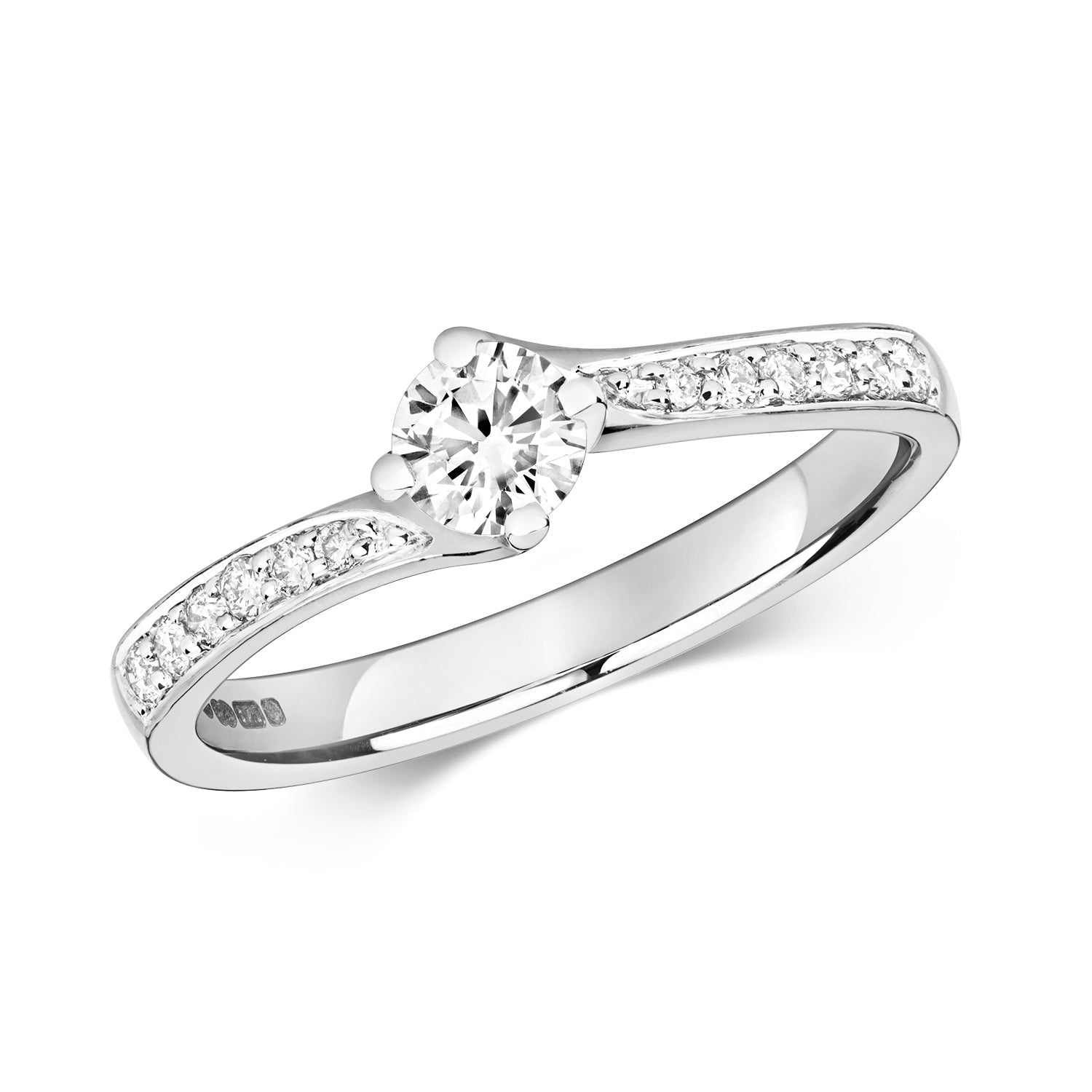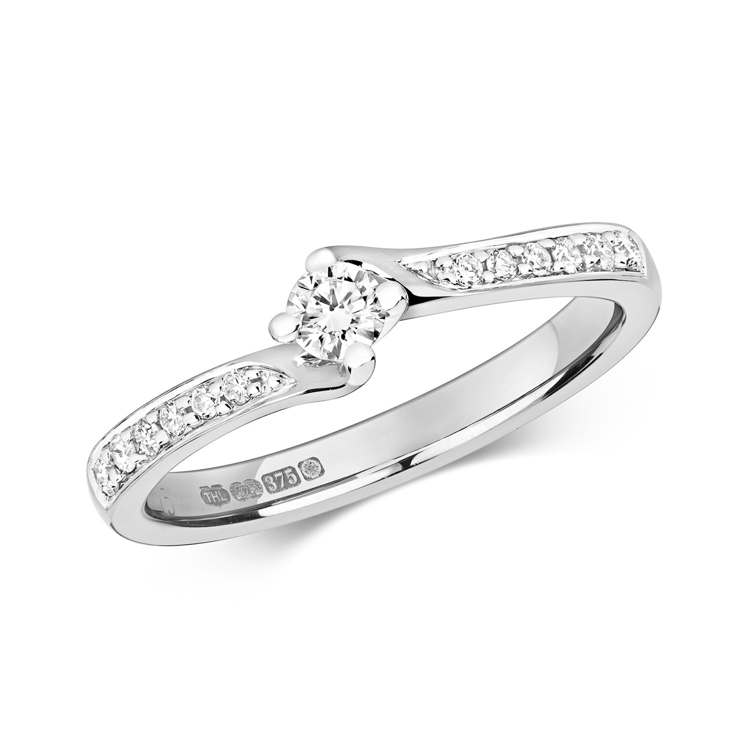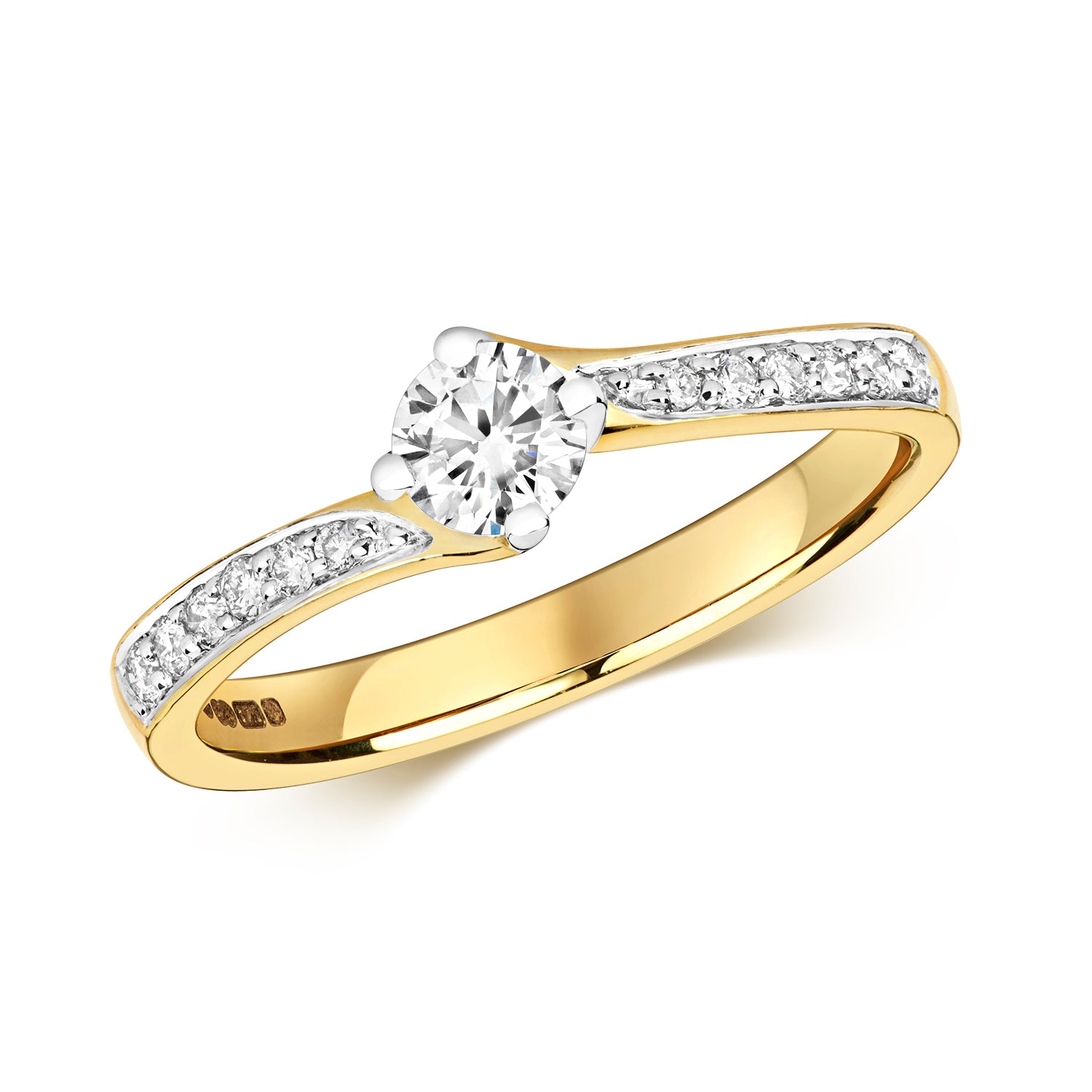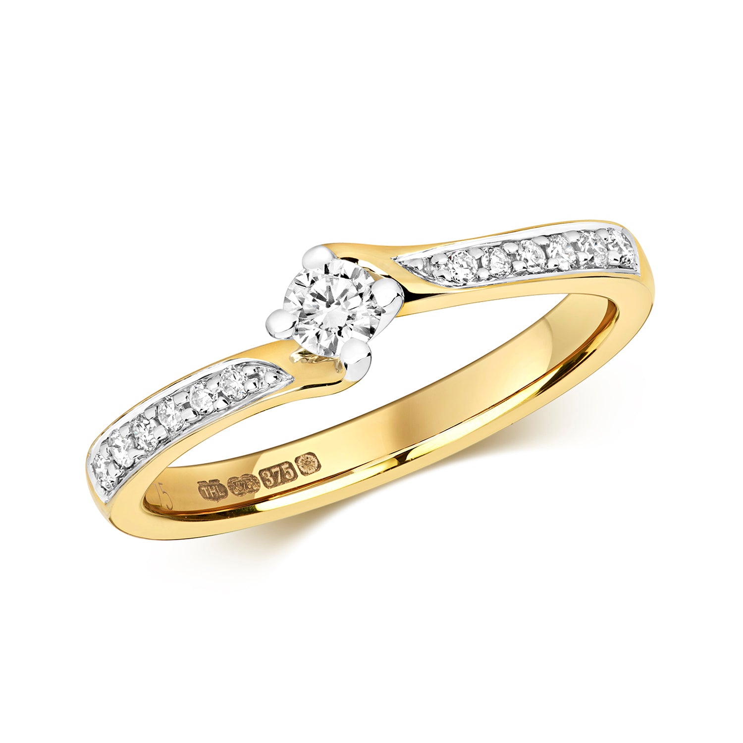 This enchanting 9ct Gold Diamond twist solitaire ring combines contemporary design with timeless elegance. The centrepiece is a brilliant cut Diamond, securely held in a prong setting, which twists gracefully around the finger to catch the light from every angle. Enhancing the allure of the centre stone are the Diamond set shoulders, featuring channel set brilliant cut Diamonds that add extra sparkle and sophistication to the overall design. With a total carat weight ranging from 0.20ct to 0.47ct, this ring offers a dazzling display of refined beauty.