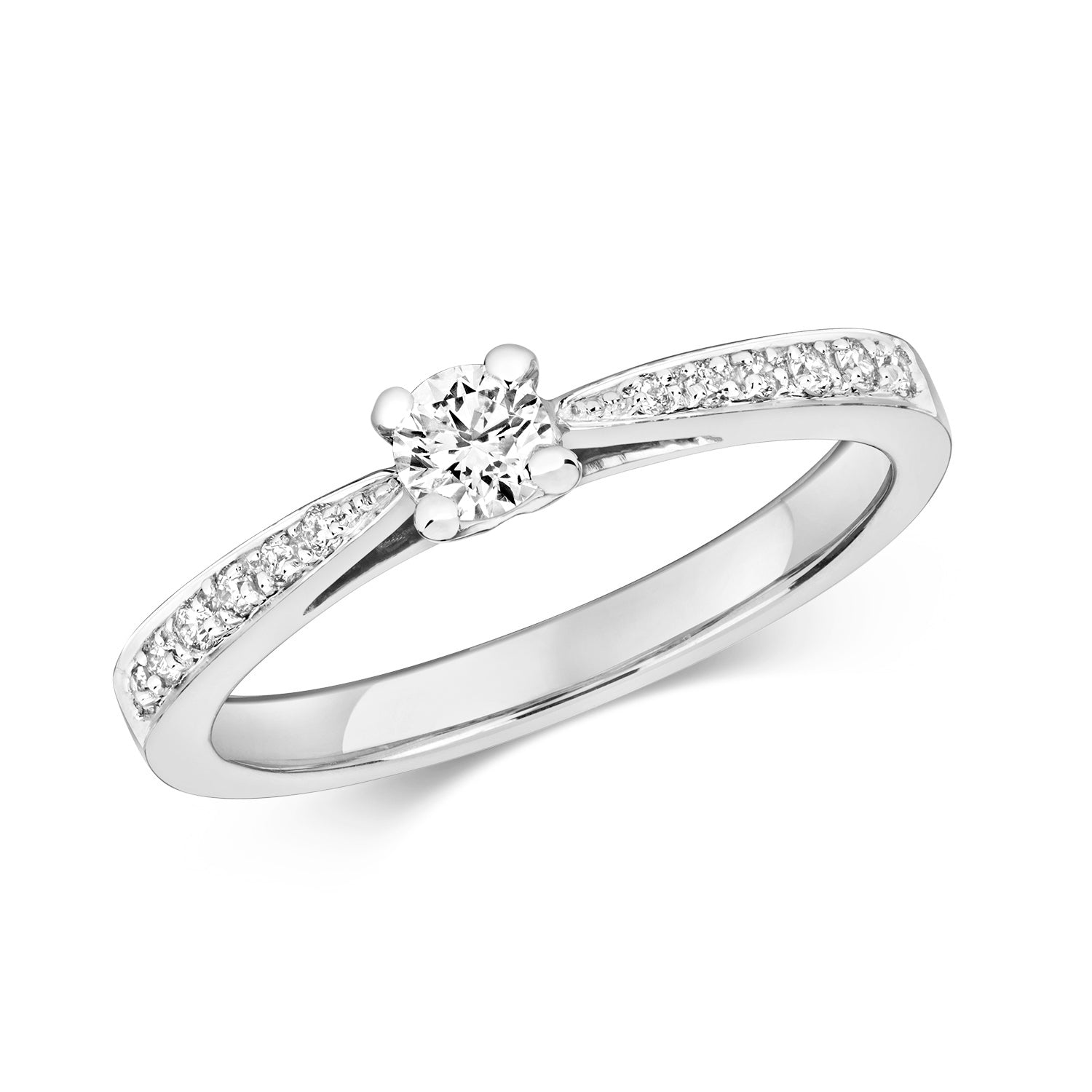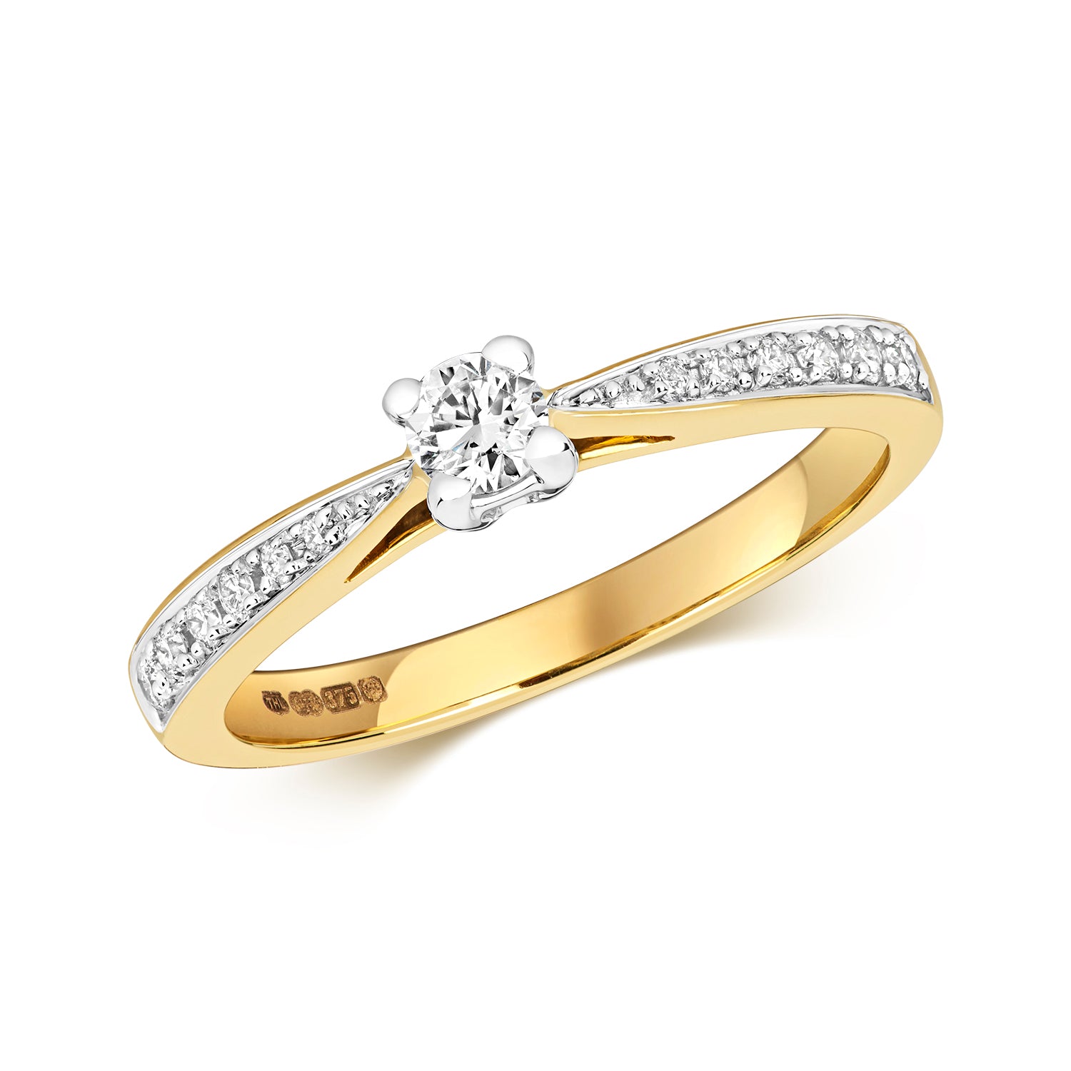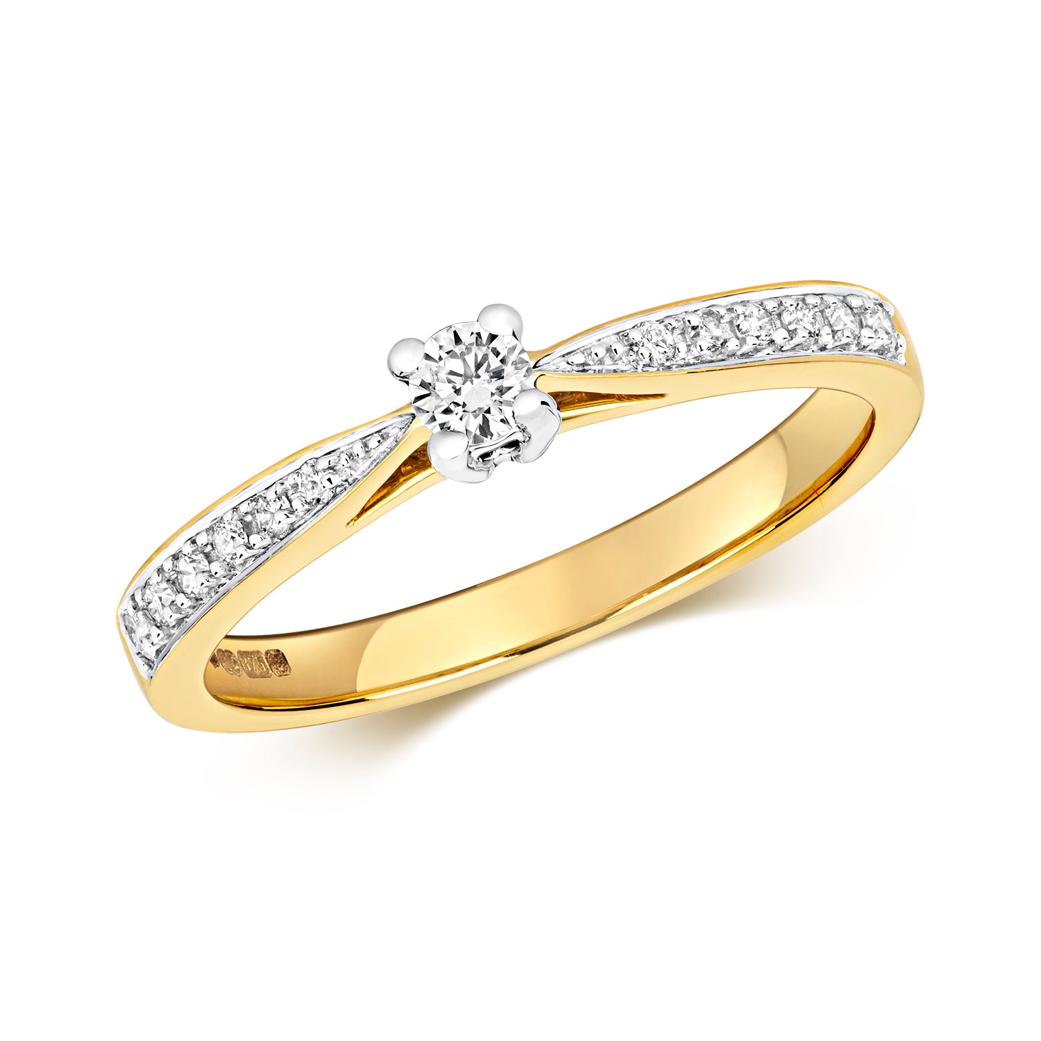 This exquisite 9ct Gold Diamond solitaire ring is a perfect blend of classic elegance and modern sophistication. The centrepiece is a brilliant cut Diamond, securely held in a prong setting, allowing it to shine with exceptional brilliance. Complementing the centre stone are Diamond set shoulders, each accent Diamond meticulously channel set to enhance the overall sparkle and elegance of the ring. With a total carat weight ranging from 0.20ct to 0.32ct, this ring offers a stunning display of luxury and refinement.