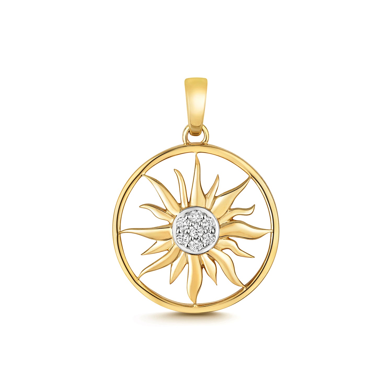 This elegant pendant features a radiant sun design, expertly crafted from 9ct yellow Gold. The centerpiece of this stunning piece is set with a cluster of 7 brilliant cut Diamonds, set to sparkle at the heart of the sun.