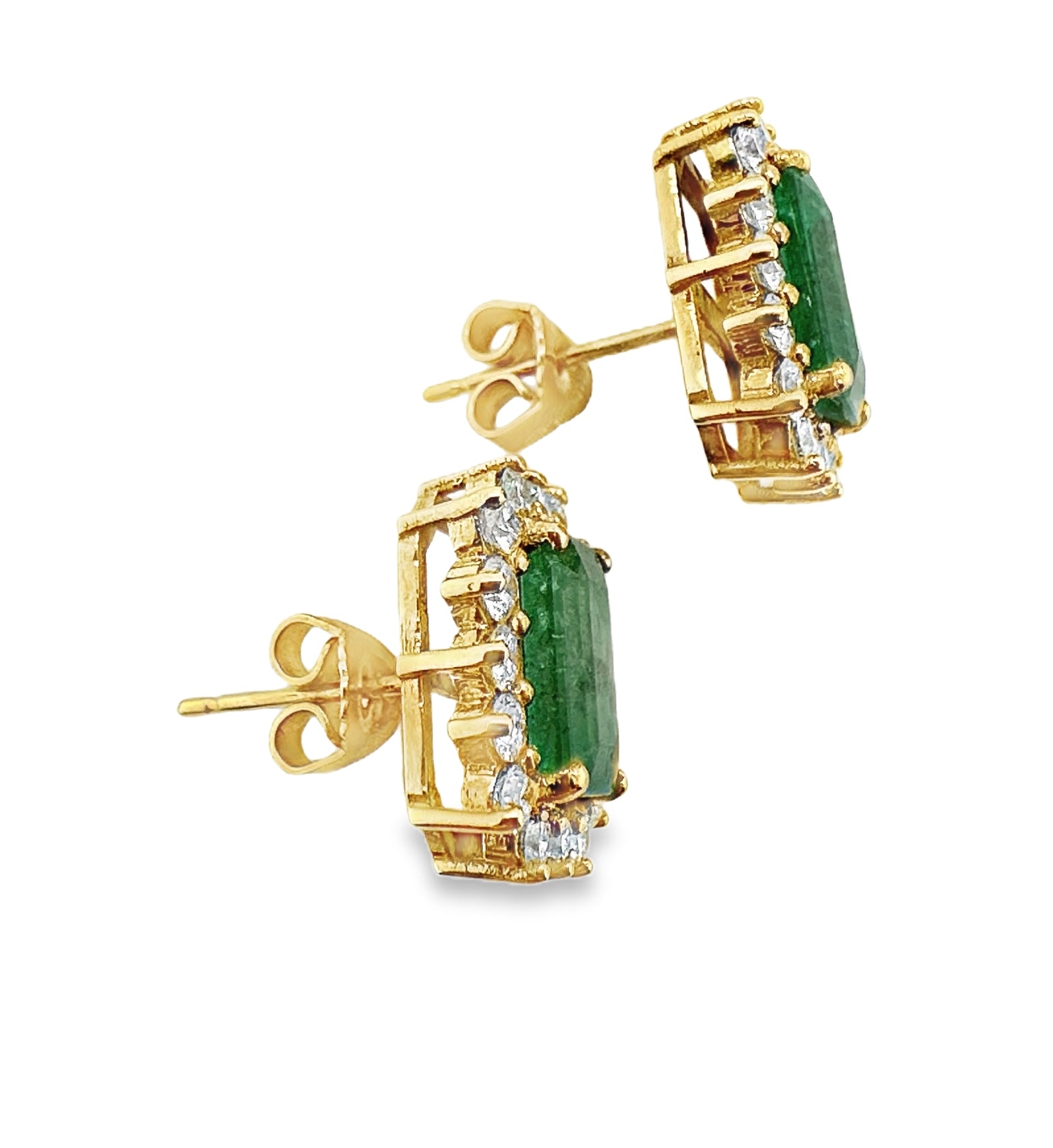 Surrounding each emerald are 16 sparkling diamonds, forming a classic halo that enhances the center stones with brilliance and dimension. These diamonds are carefully set to maximize fire and clarity, offering just the right amount of shimmer without overpowering the emeralds.