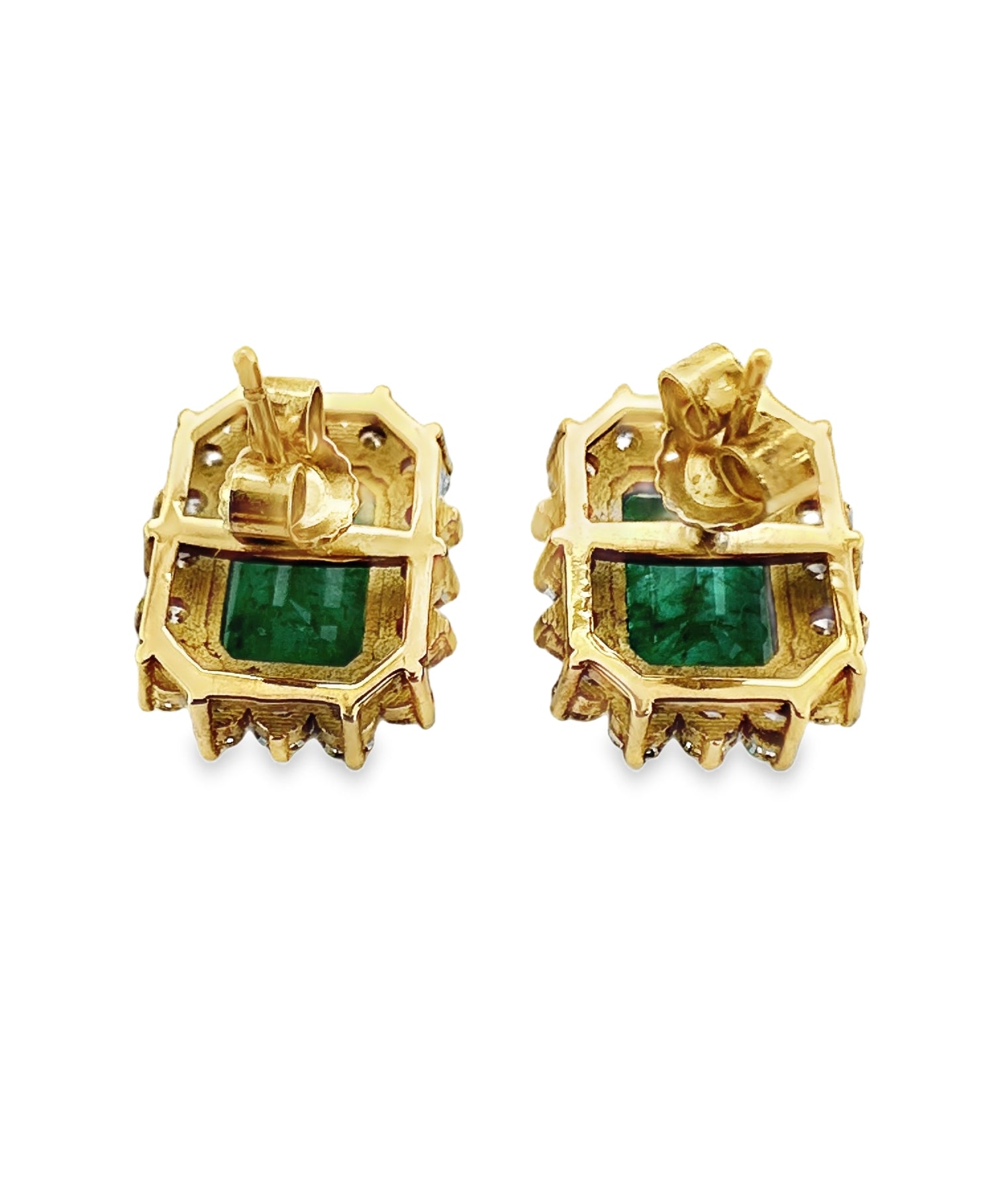 Each earring features a vivid emerald-cut emerald weighing approximately 1.9 carats — a total of 3.8 carats of rich green brilliance. The emeralds display a deep, saturated hue with beautiful internal life, and are expertly cut to highlight their natural beauty.