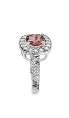 The total diamond weight is approximately 0.80 carats, offering a beautiful contrast to the vivid pink centre stone. Crafted in luxurious 18ct white gold, this ring combines elegance, sparkle, and modern femininity – perfect for engagements, anniversaries, or as a treasured statement ring.