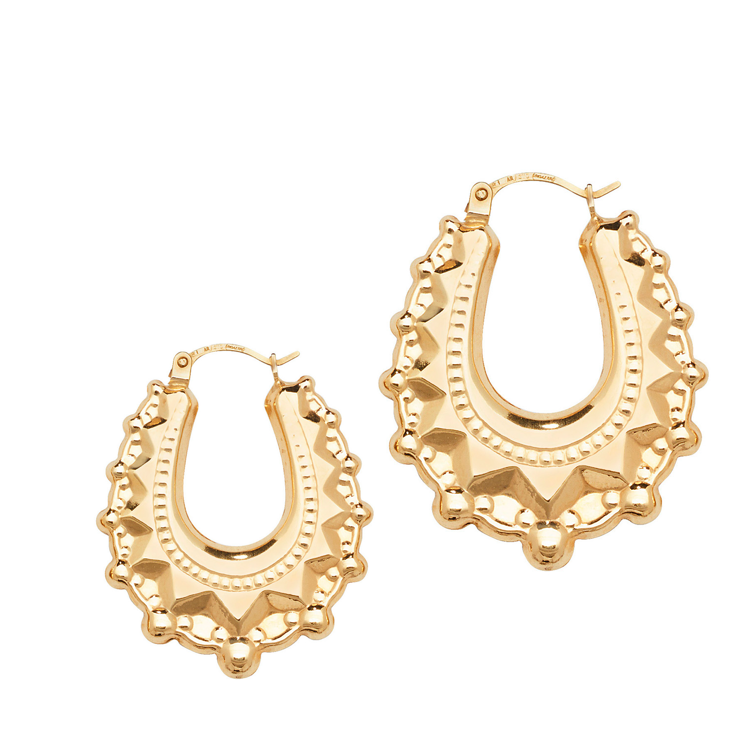 enhance your jewellery collection with these stunning 9ct yellow gold oval Creole earrings in a medium size. Featuring a sophisticated oval hoop design, these earrings offer a perfect blend of timeless elegance and everyday style. The polished yellow gold finish adds a warm, luxurious glow, making them versatile enough to wear with casual outfits or for more formal occasions.