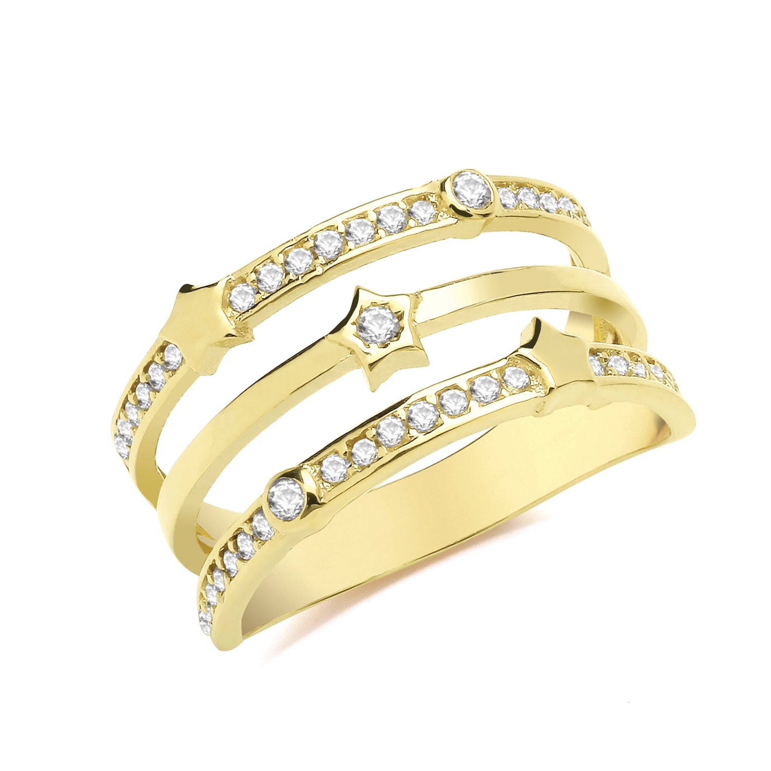 Shine bright with this stunning 9ct Yellow Gold Three Band Star Cubic Ring. Designed to captivate, this ring features three delicate bands adorned with sparkling cubic zirconia, beautifully accented by star motifs for a celestial touch. Crafted from high-quality 9ct yellow gold, its layered design creates a statement look while remaining elegant and versatile—perfect for both everyday wear and special occasions.