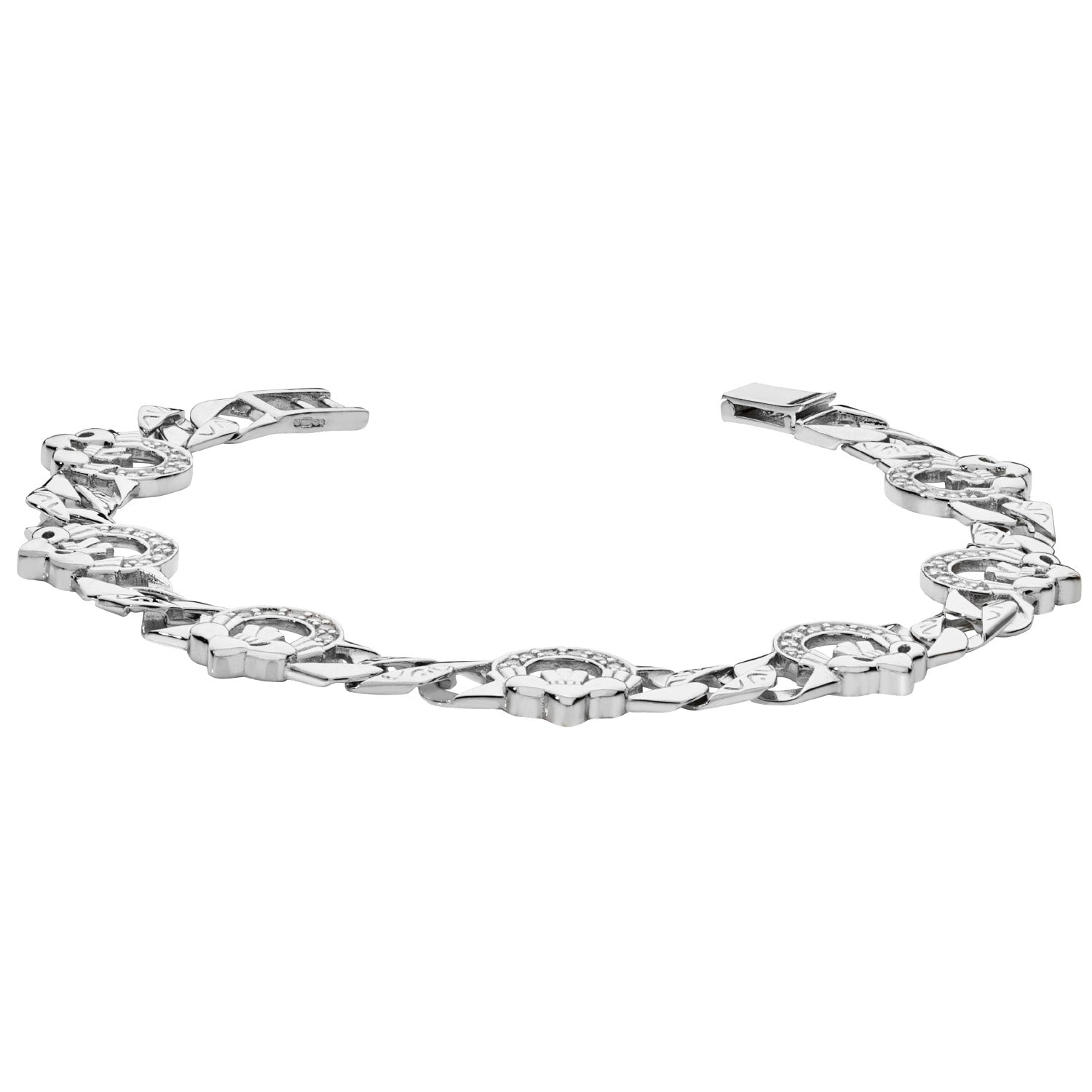 Celebrate love, loyalty, and friendship with this Sterling Silver Cast Ladies' CZ Claddagh Bracelet, beautifully crafted from high-quality 925 sterling silver. This elegant bracelet features intricately designed Claddagh symbols, each set with sparkling cubic zirconia stones, adding a touch of brilliance to its meaningful design.