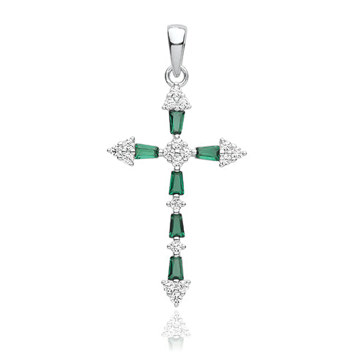 Add a vibrant touch of elegance to your collection with our Sterling Silver Cubic Zirconia Tapered Green Baguette Cross. This striking design features six tapered baguette-cut green cubic zirconia stones, creating the arms of the cross, with clusters of clear cubic zirconia nestled between each baguette for added sparkle. The cross is crafted in high-quality sterling silver and features a sleek V-loop clasp for secure attachment. An optional chain is available to complete the look. Perfect for adding a pop of colour to your outfit or as a thoughtful gift, this cross is a stunning combination of style and meaning.