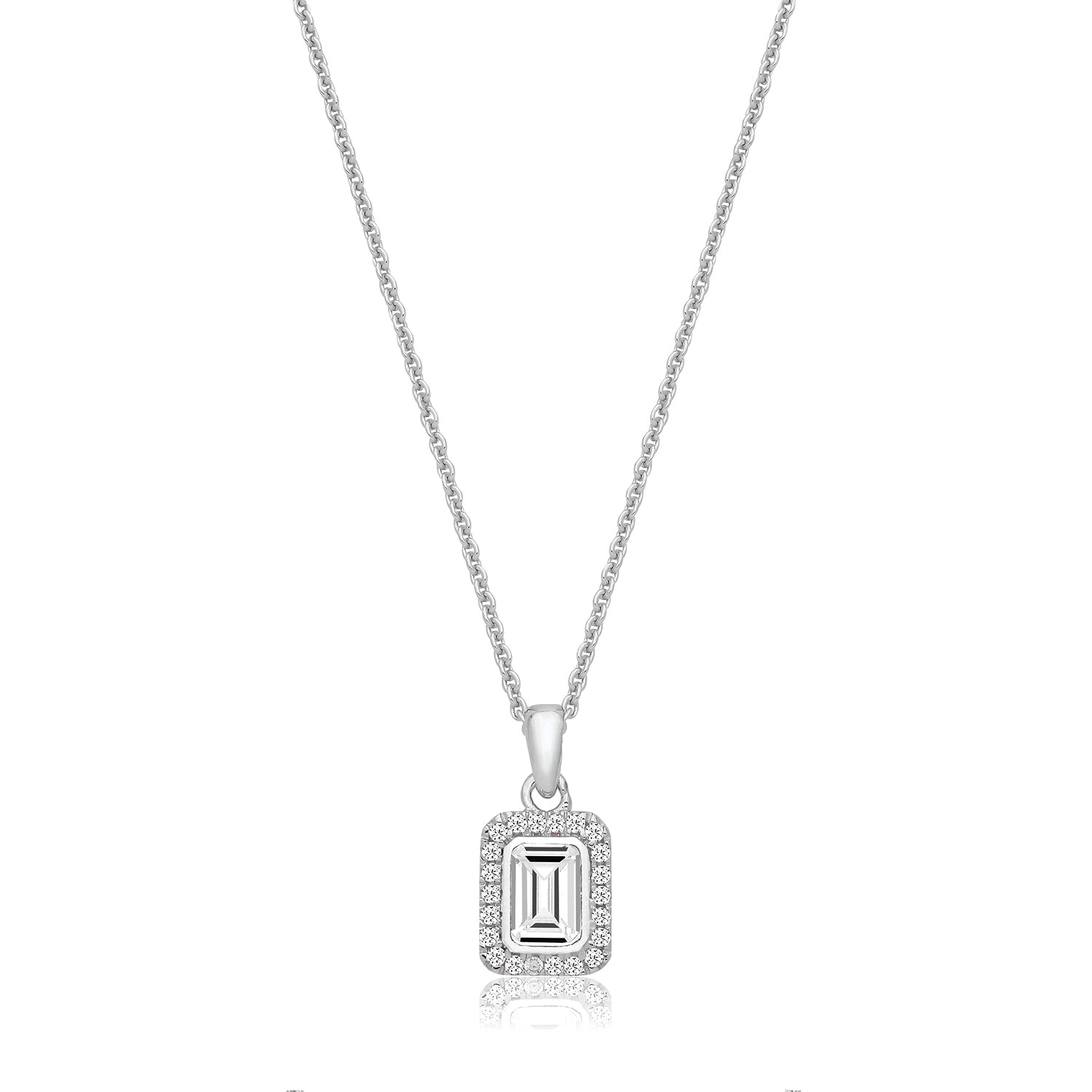 Silver Bezel-Set Emerald-Cut Halo CZ Pendant & Chain – Rhodium Plated