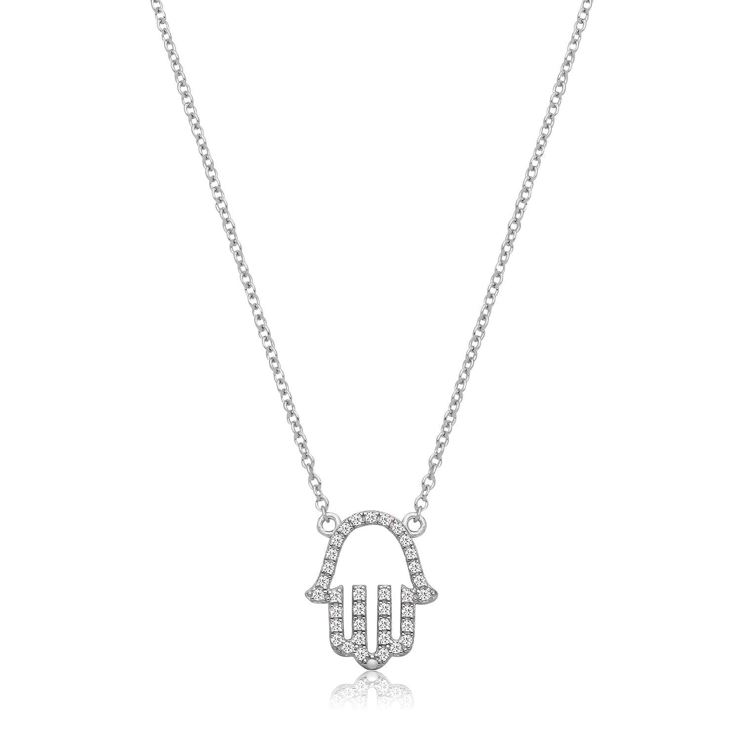 Sterling Silver Fine Open Cubic Zirconia Hamsa Pendant (16"+2"Chain Included)