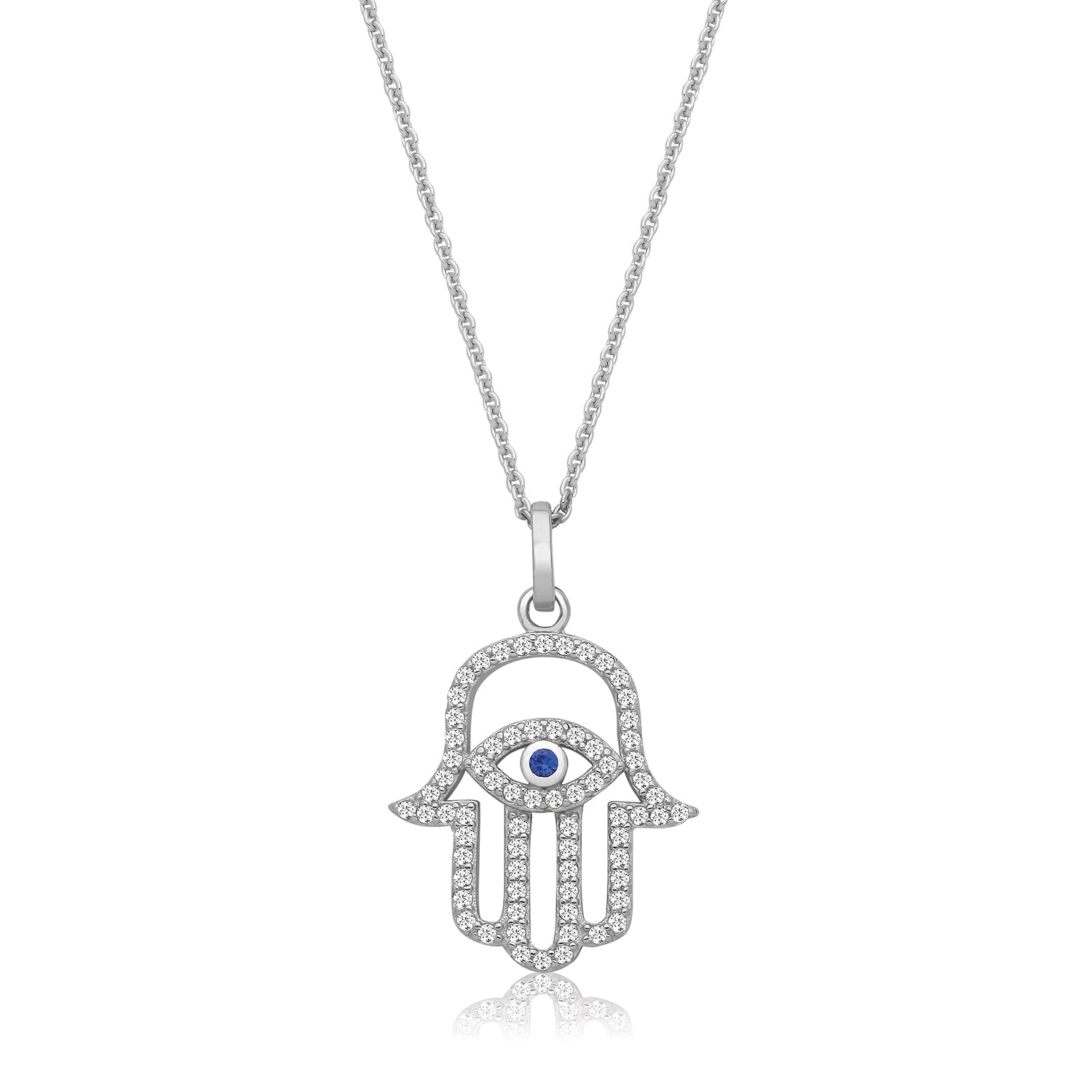 Sterling Silver Hamsa & Evil Eye Blue and White CZ Pendant & Chain – Rhodium Plated