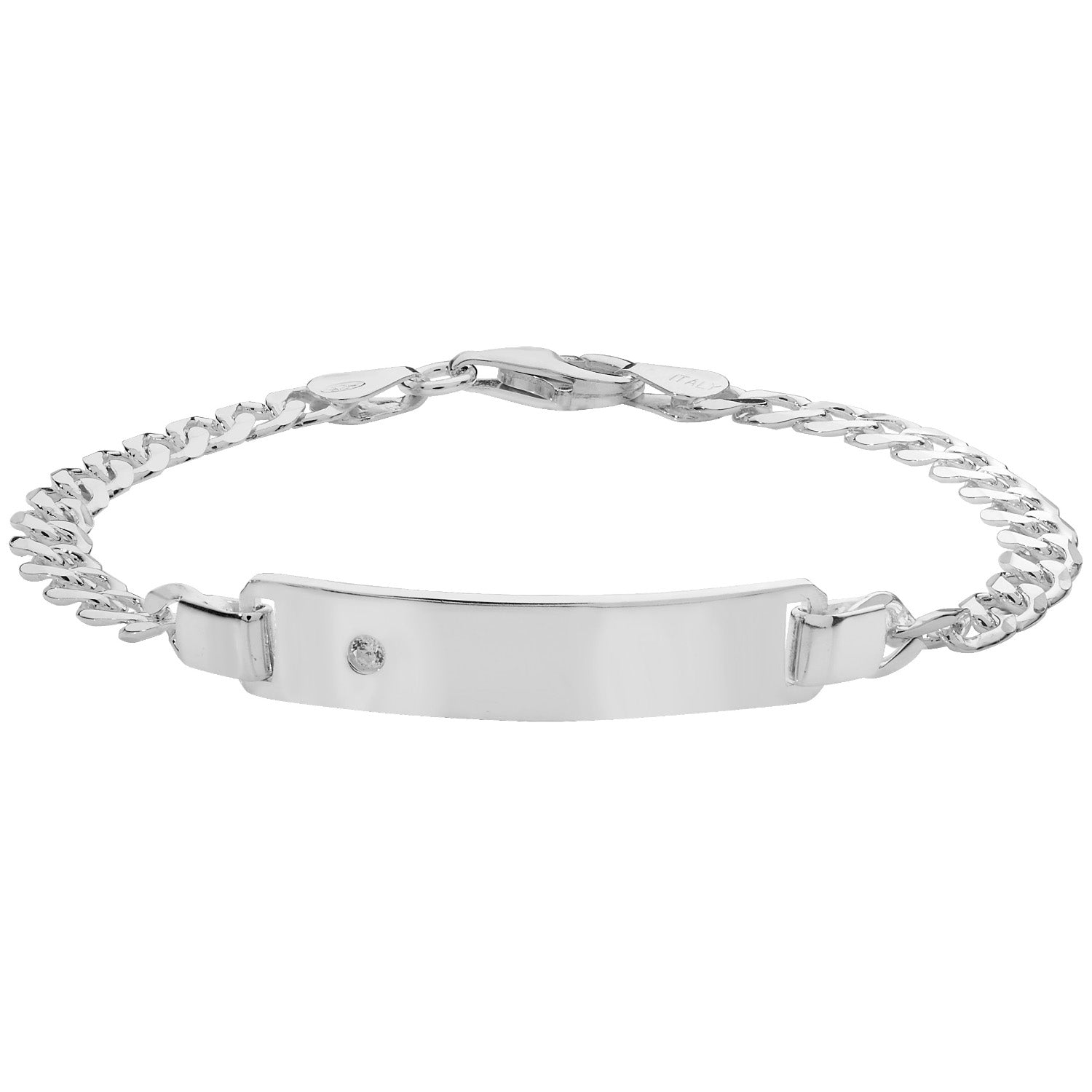 Add a touch of sophistication with this silver ladies' curb CZ set ID bracelet, featuring a single cubic zirconia stone delicately set in the sleek ID bar. Crafted from high-quality sterling silver, this bracelet boasts a classic curb chain design, offering both durability and timeless elegance. Perfect for personalisation, the engravable ID plate makes this piece an ideal gift for birthdays, anniversaries, or special milestones.