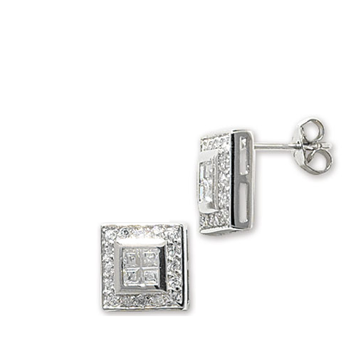 Silver Square Cubic Zirconia Four Stone Centre Halo Stud Earrings (10mm)