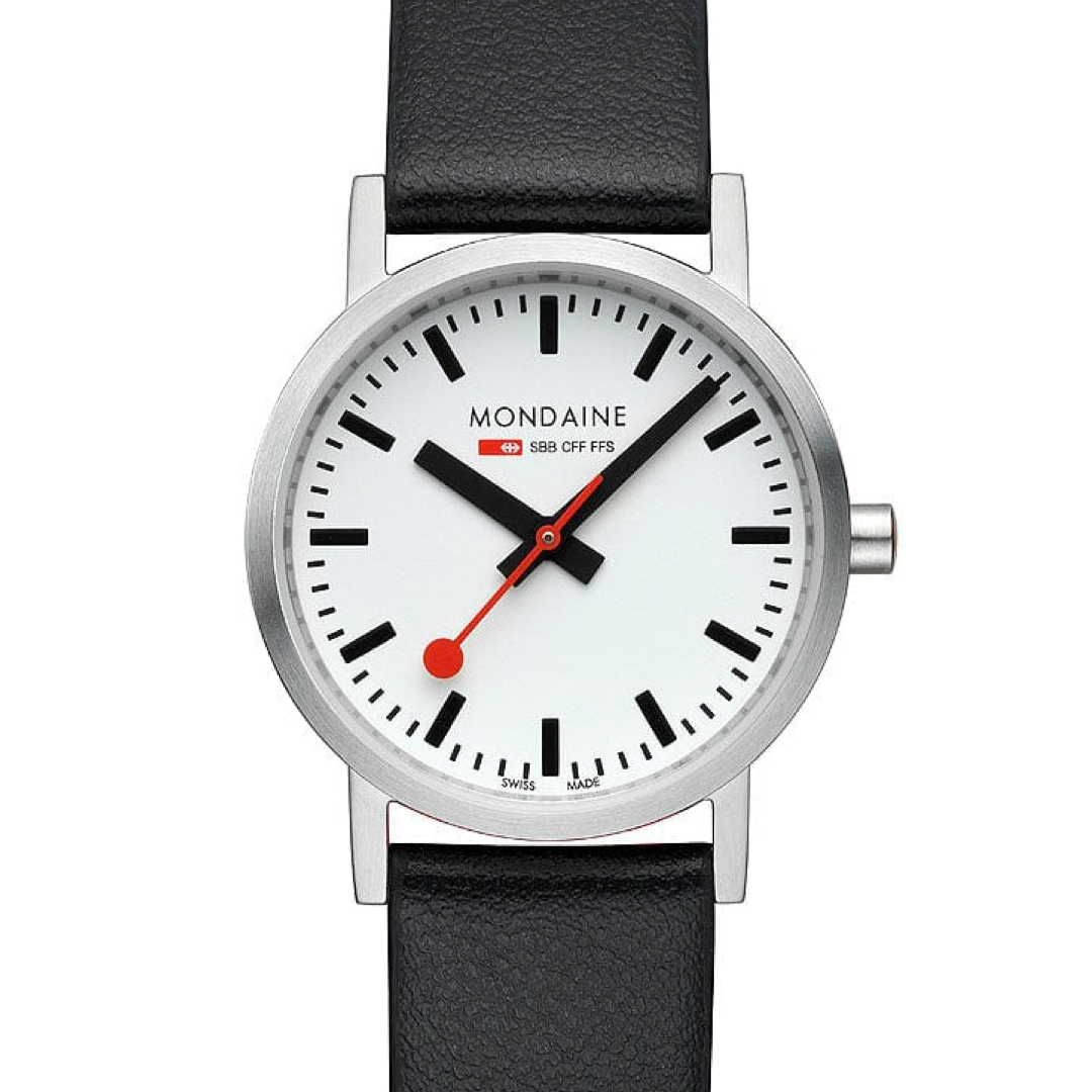 The Mondaine Classic 30mm is a perfect blend of Swiss precision and sustainable design. This elegant timepiece features a polished stainless steel case, a crisp white dial, and Mondaine's iconic red second hand for a minimalist yet bold look. The black vegan grape leather strap, made from 75% eco-composite vegetable materials and 25% recycled PET, reflects Mondaine’s commitment to sustainability. With its refined 30mm size, this watch offers both comfort and style, making it an ideal accessory for the eco-conscious individual.