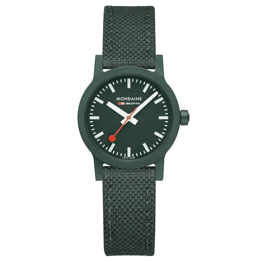 The Mondaine Essence with Park Green textile strap is the perfect choice for those who value sustainability without compromising on style or performance.