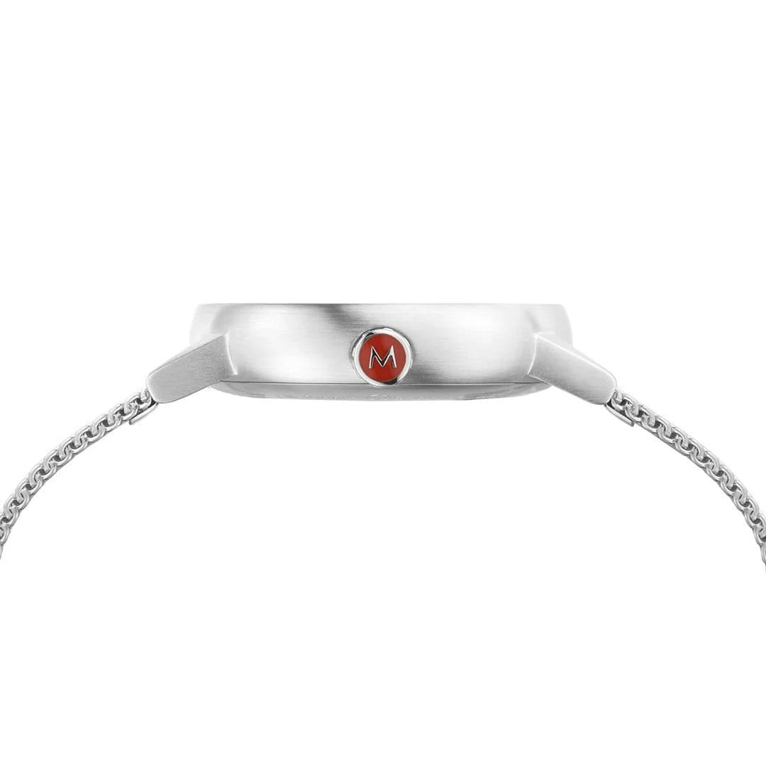 The Milanese mesh strap adds a sophisticated touch, while its vegan, non-easy-change design aligns with eco-conscious values. Committed to sustainability, this timepiece is comprehensively CO2 neutral, assembled using up to 80% solar energy from Mondaine’s own photovoltaic system.
