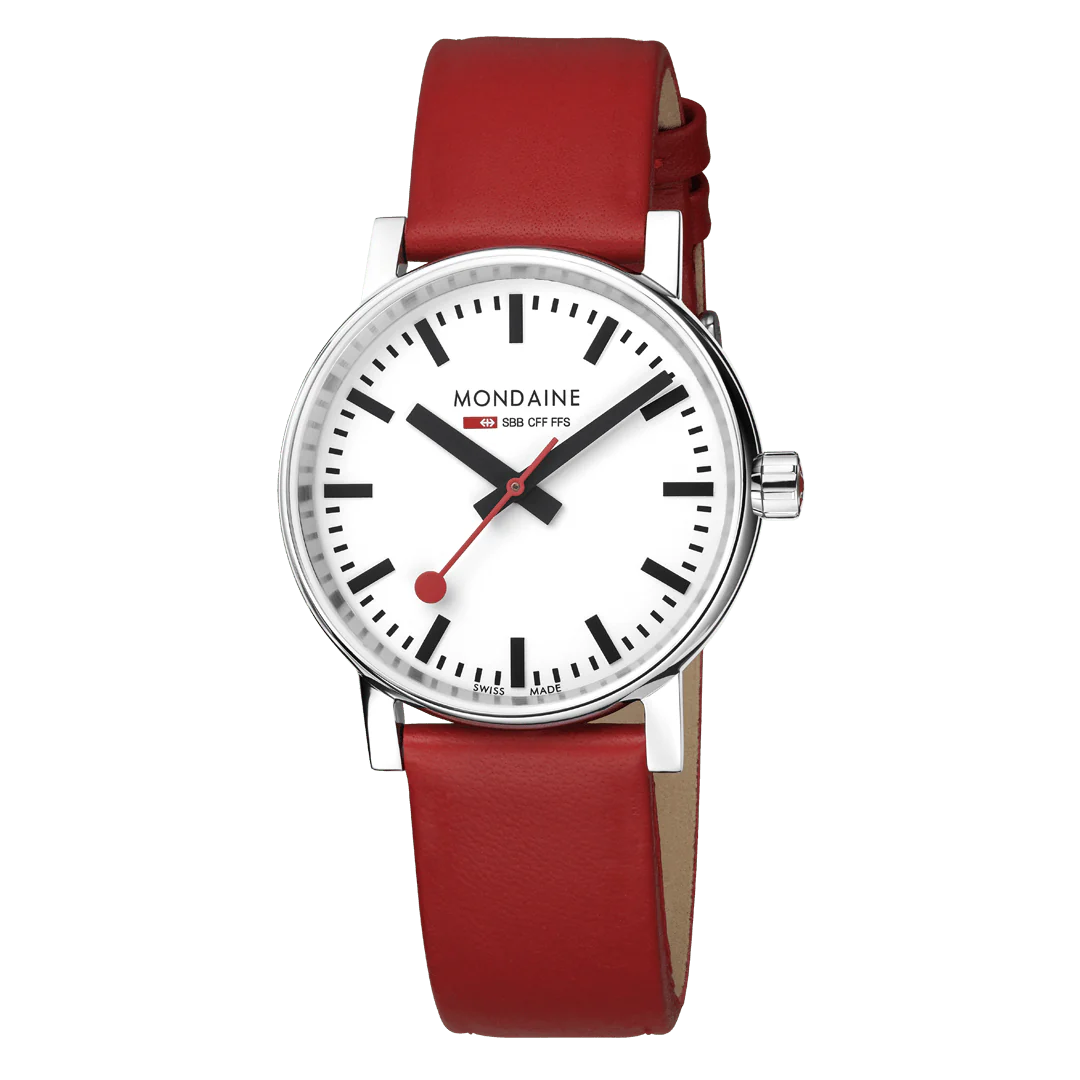 A true classic, the Mondaine Evo2 with a red strap is a perfect fusion of tradition, innovation, and Swiss heritage.