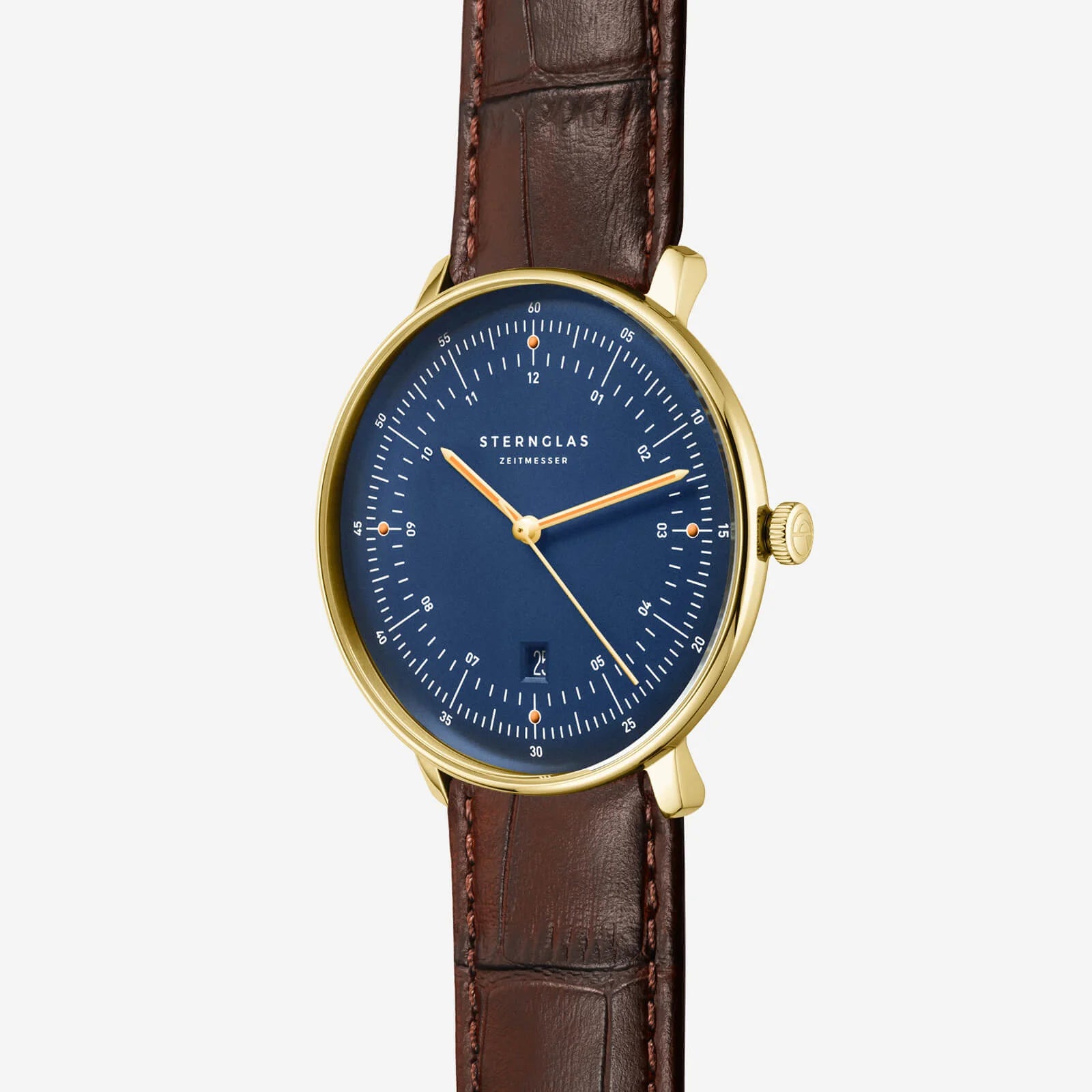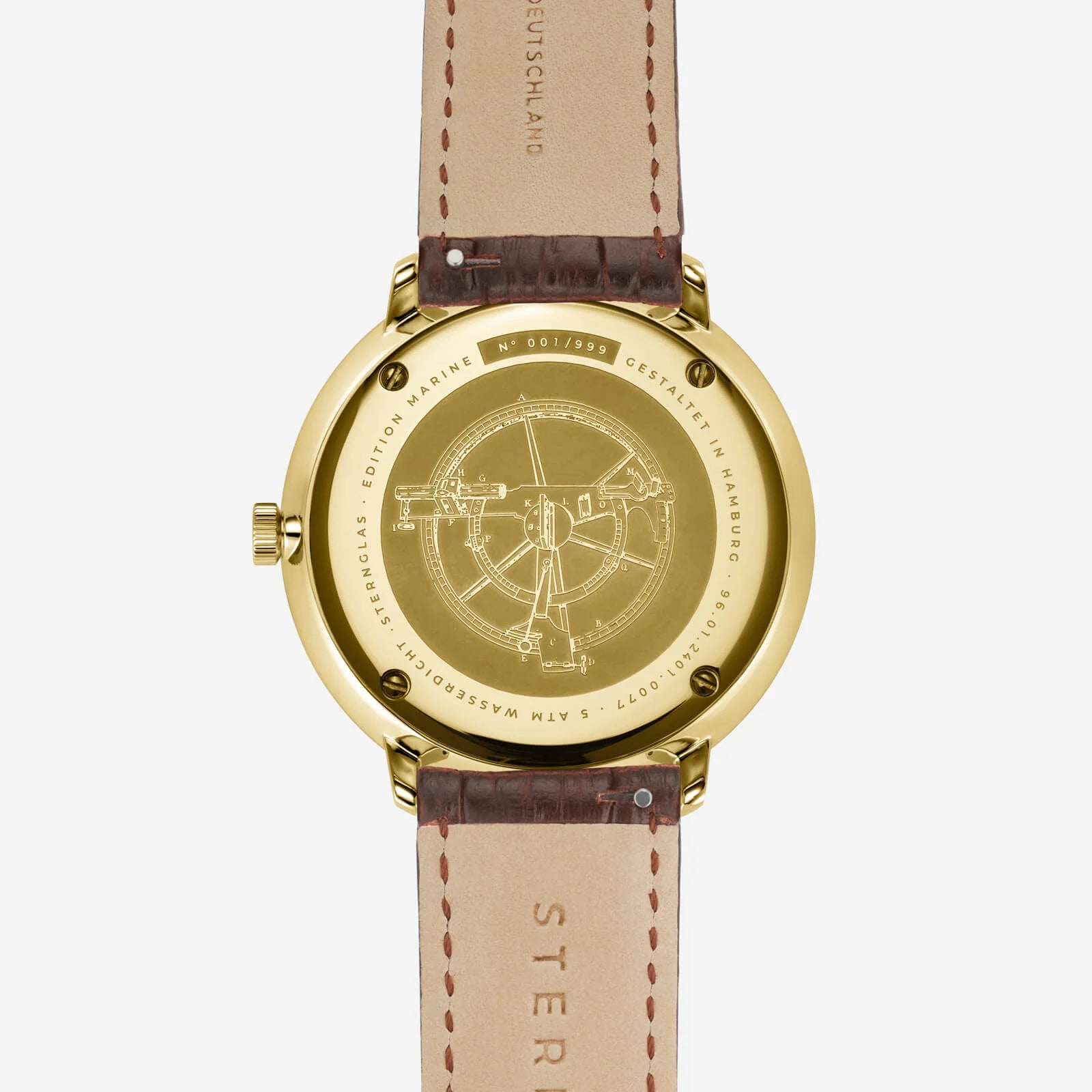 The Hamburg Edition Marine 42 mm Quartz watch blends classic maritime elegance with modern craftsmanship. Its polished 316L stainless steel case, enhanced with a luxurious PVD-gold finish, stands at 42 mm in diameter and only 6 mm in height, offering a sleek, sophisticated look. The domed sapphire crystal with double anti-reflective coating ensures durability and clear visibility, making it a refined choice for everyday wear.