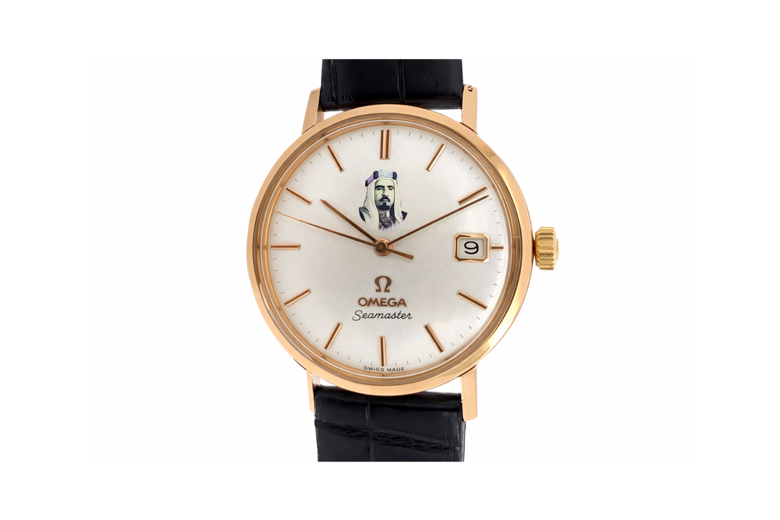 This Omega Seamaster in 18ct Solid Pink is extremely rare, it showcases a portrait of Sheikh Isa Bin Salman Al Khalifa at the 12 o’clock position and a date window at the 3 o’clock position.