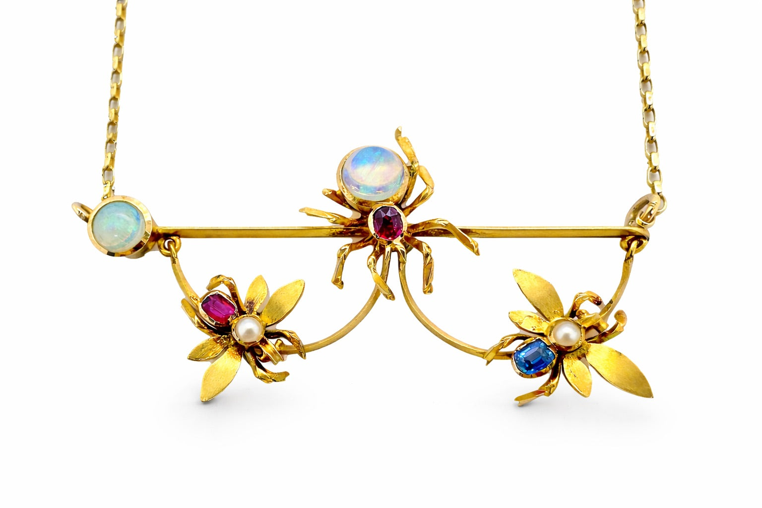 At the heart of this unique pendant is an intricately crafted spider, poised delicately on a slender gold bar. The spider features a striking 5.6mm opal as its abdomen, showcasing vivid flashes of colour, and a 2.7mm ruby forming its cephalothorax, adding a rich, red contrast.