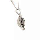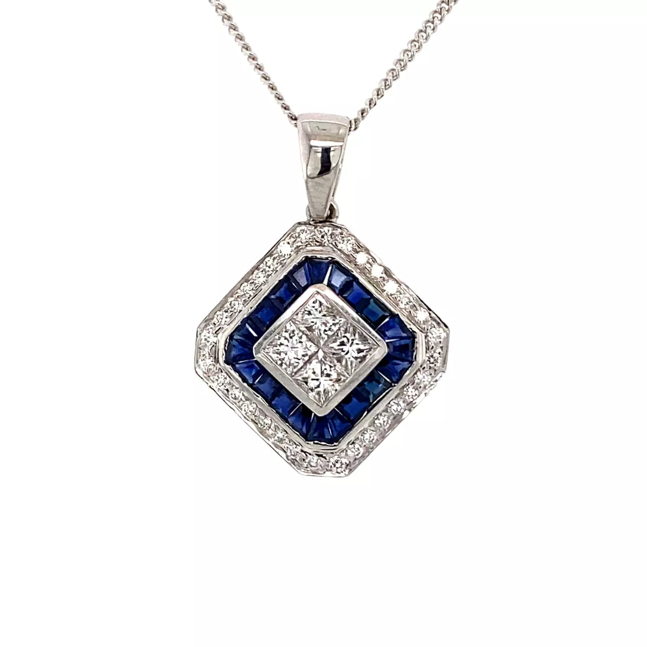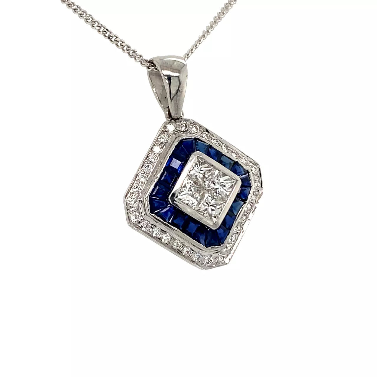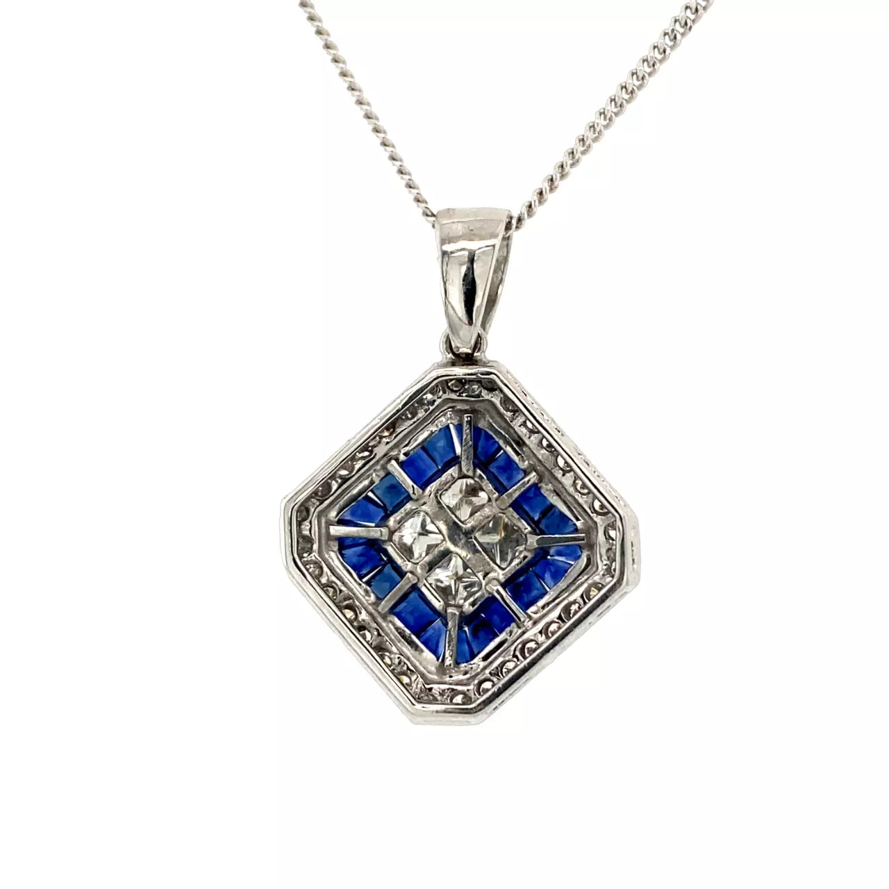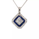 A breathtaking, one-of-a-kind Art Deco-style pendant, masterfully designed to captivate. This exceptional piece boasts a dazzling 1.24ct of Diamonds and 0.42ct of Sapphires, arranged in an intricate, vintage-inspired setting. At its center, four mesmerising princess-cut Diamonds of approximately 0.15ct each take the spotlight, surrounded by a halo of brilliant-cut Diamonds and beautifully mixed-cut Sapphires. The gemstones shimmer effortlessly against the exquisite 18ct white Gold mount, enhancing the pendant’s timeless elegance. Measuring 17.5mm x 17.5mm and weighing 6 grams, this statement piece is paired with a sophisticated, tight curb 18ct white Gold chain. A true testament to craftsmanship and luxury, this extraordinary pendant is presented in an elegant gift box, making it the perfect heirloom-quality treasure.