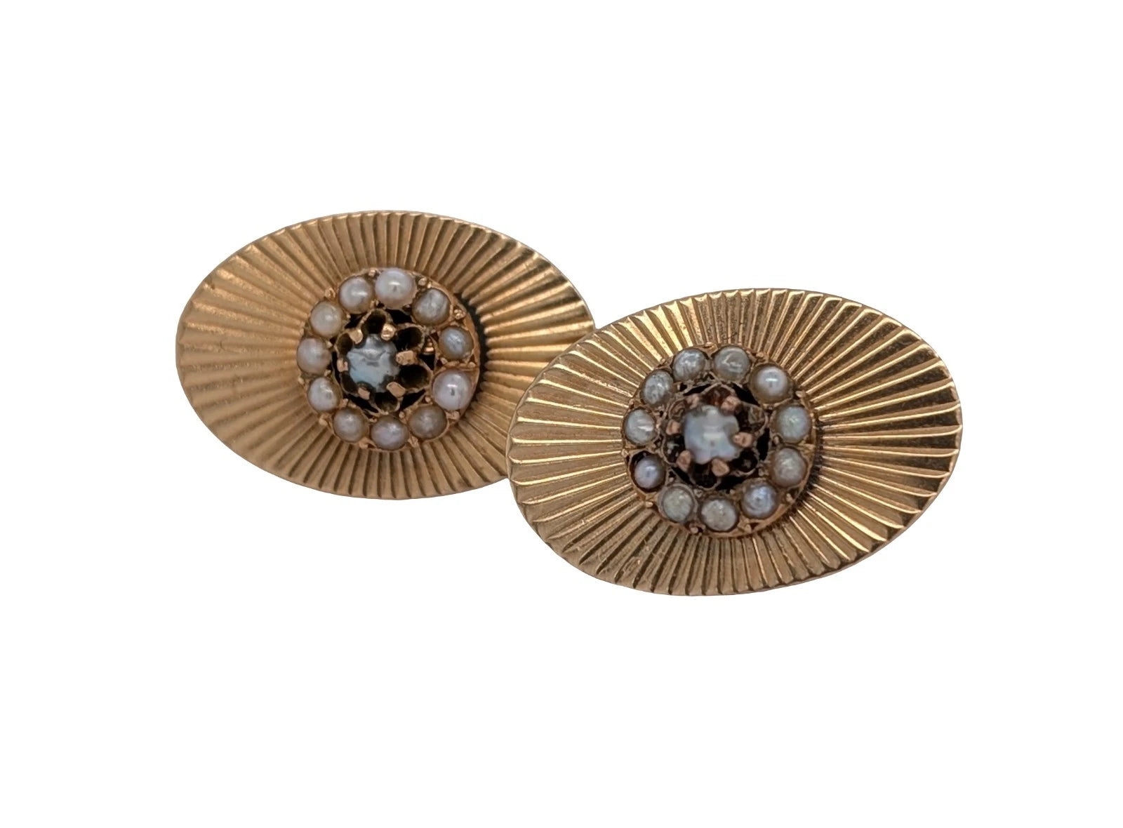 Each earring features an eye-catching diamond-cut grooved finish that reflects the light beautifully, giving the piece a refined sparkle. At the centre sits a delicate seed pearl, surrounded by a halo of ten additional seed pearls per earring — creating a stunning clustered look that feels both graceful and sophisticated.