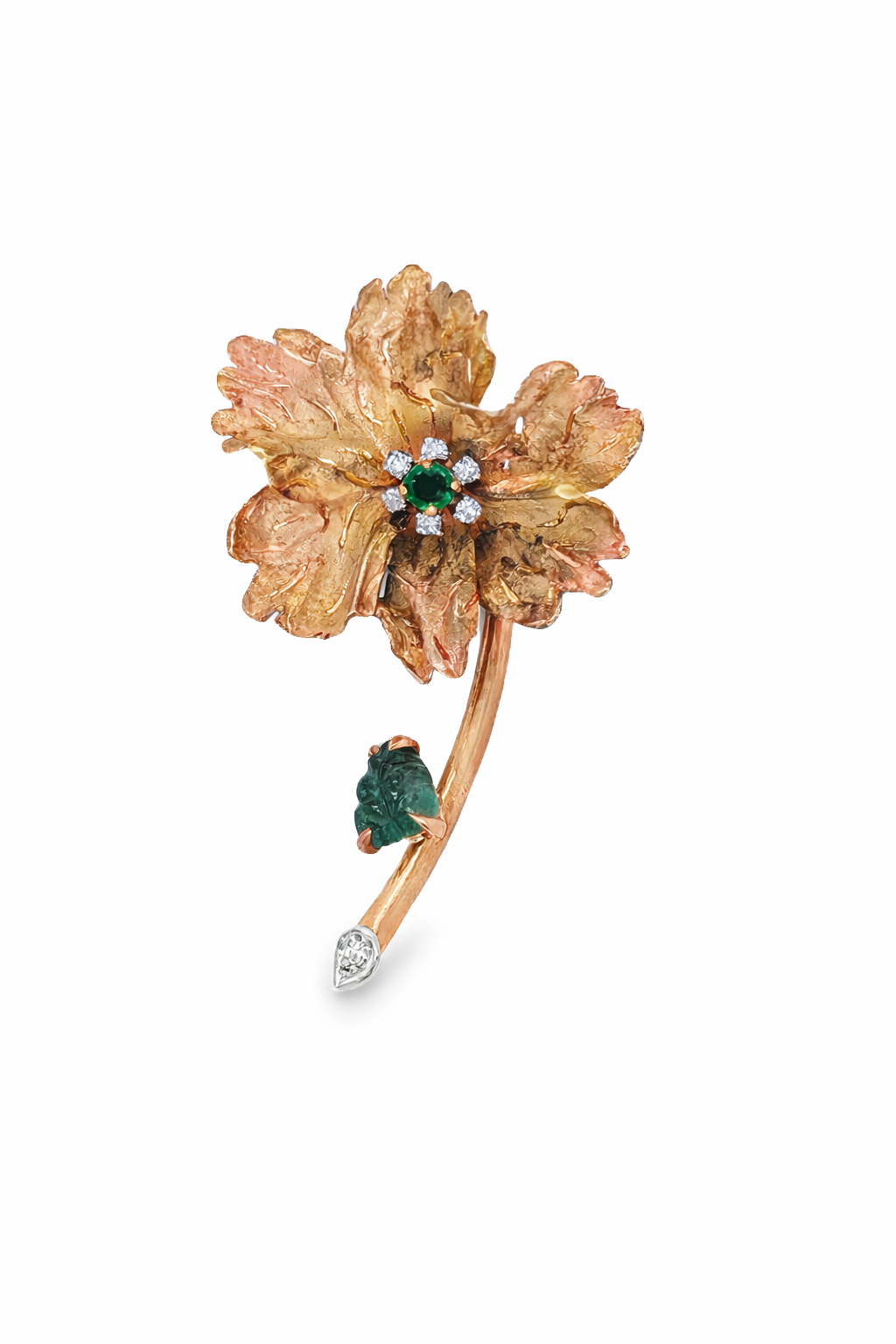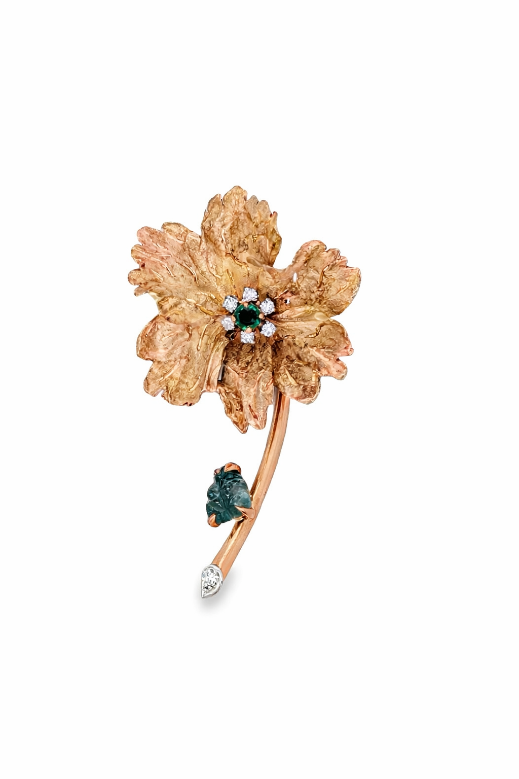 A further diamond is delicately set at the base of the stem, adding refined brilliance and enhancing the overall balance of the design. Completing the naturalistic theme is a finely carved green jade leaf, providing rich colour contrast against the warm tone of the yellow gold.