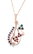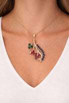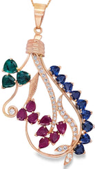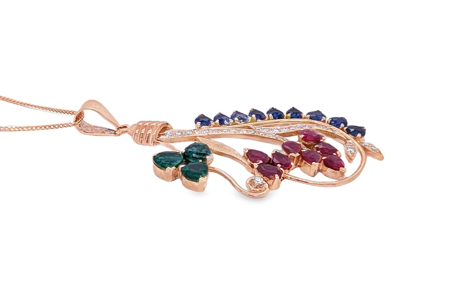 Set within the design are three pear-shaped emeralds, eight pear-shaped rubies and nine heart-shaped blue sapphires, thoughtfully arranged to enhance depth, contrast and colour. Thirty-two natural round-cut diamonds are prong set along the curves of the pendant, adding a subtle yet luxurious sparkle that highlights the craftsmanship and fluid lines of the piece.