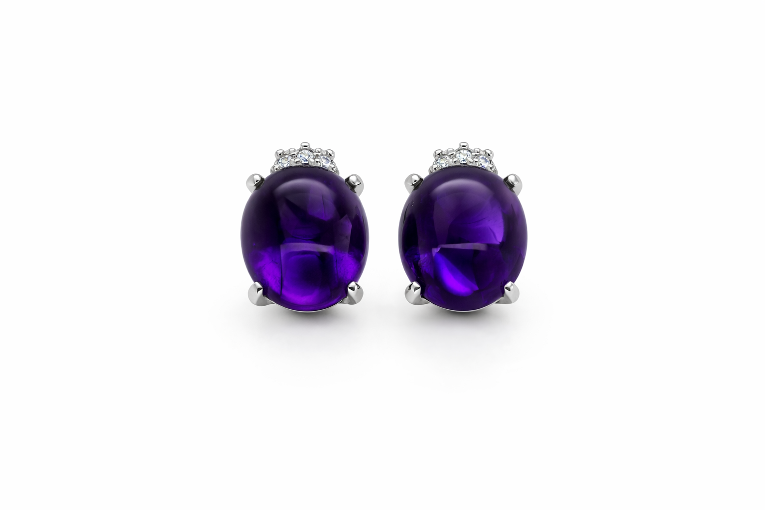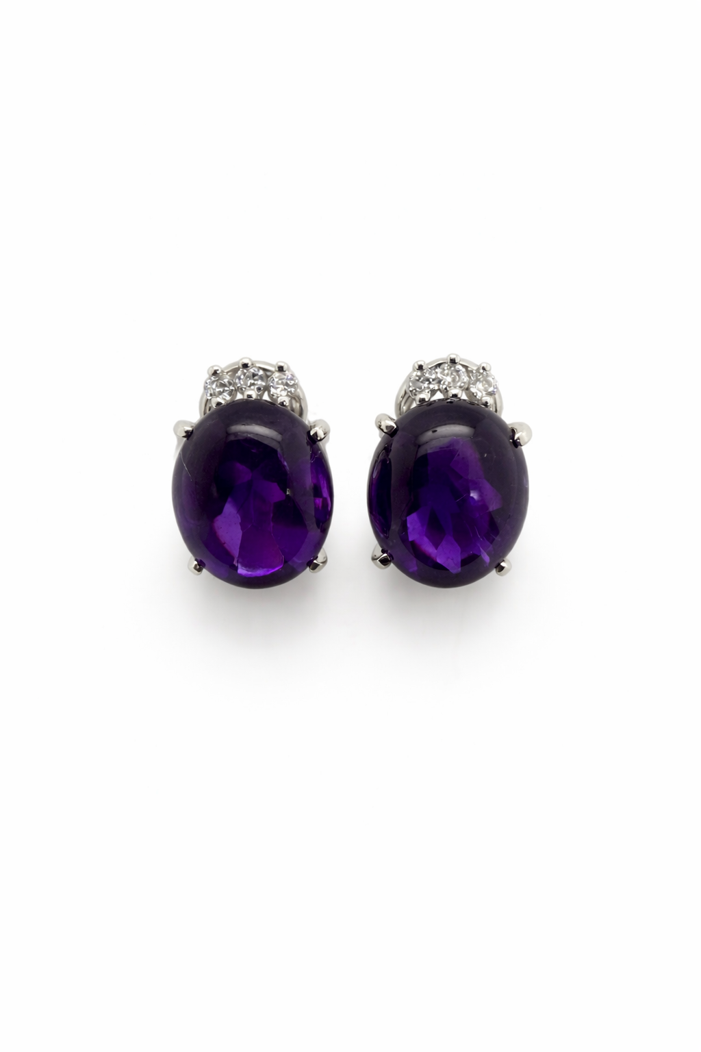 Each earring features a captivating oval amethyst measuring approximately 12mm x 10mm, displaying a deep, luxurious purple hue that catches the light beautifully. The amethysts are securely set in classic white gold mounts and accented with brilliant-cut diamonds, adding a delicate touch of radiance.