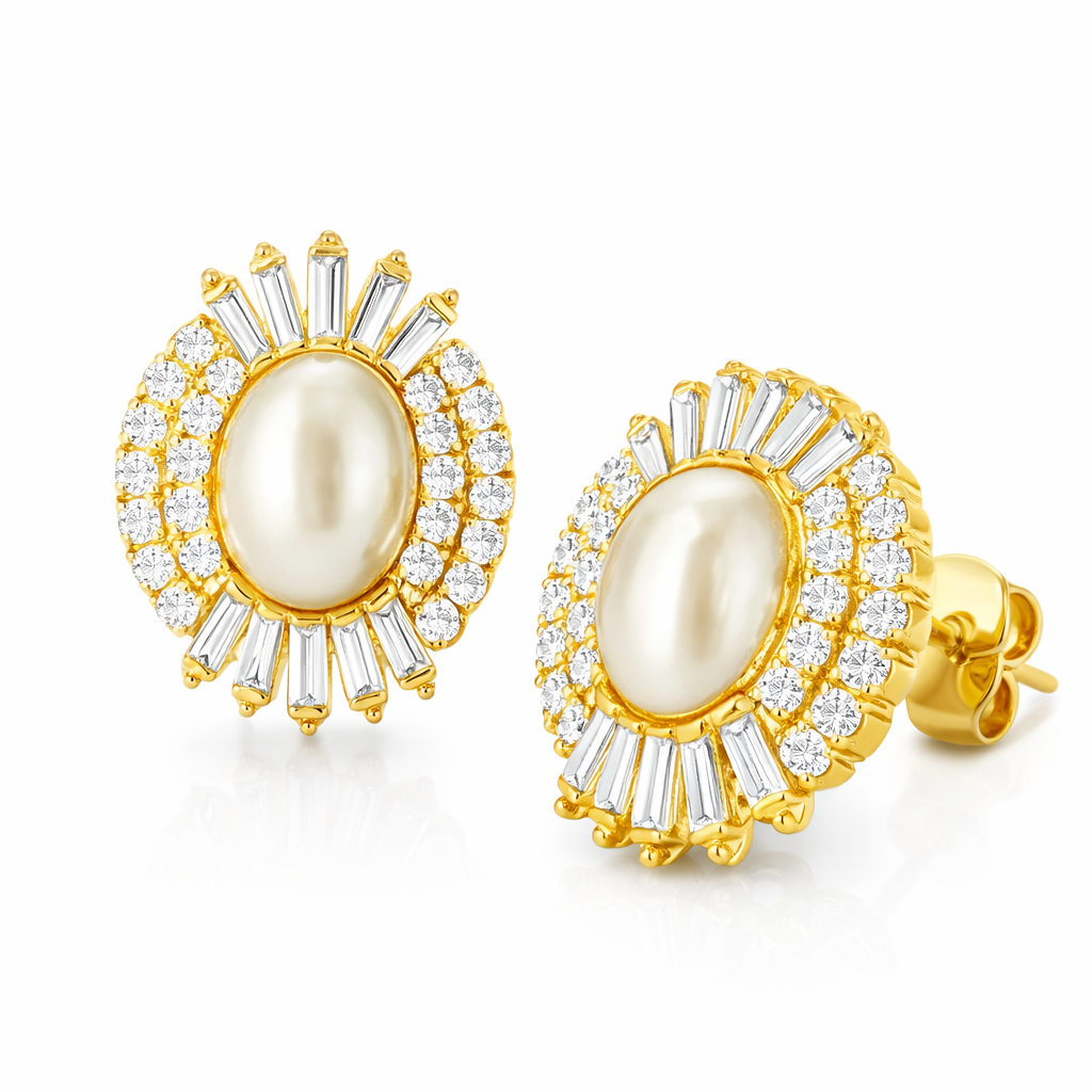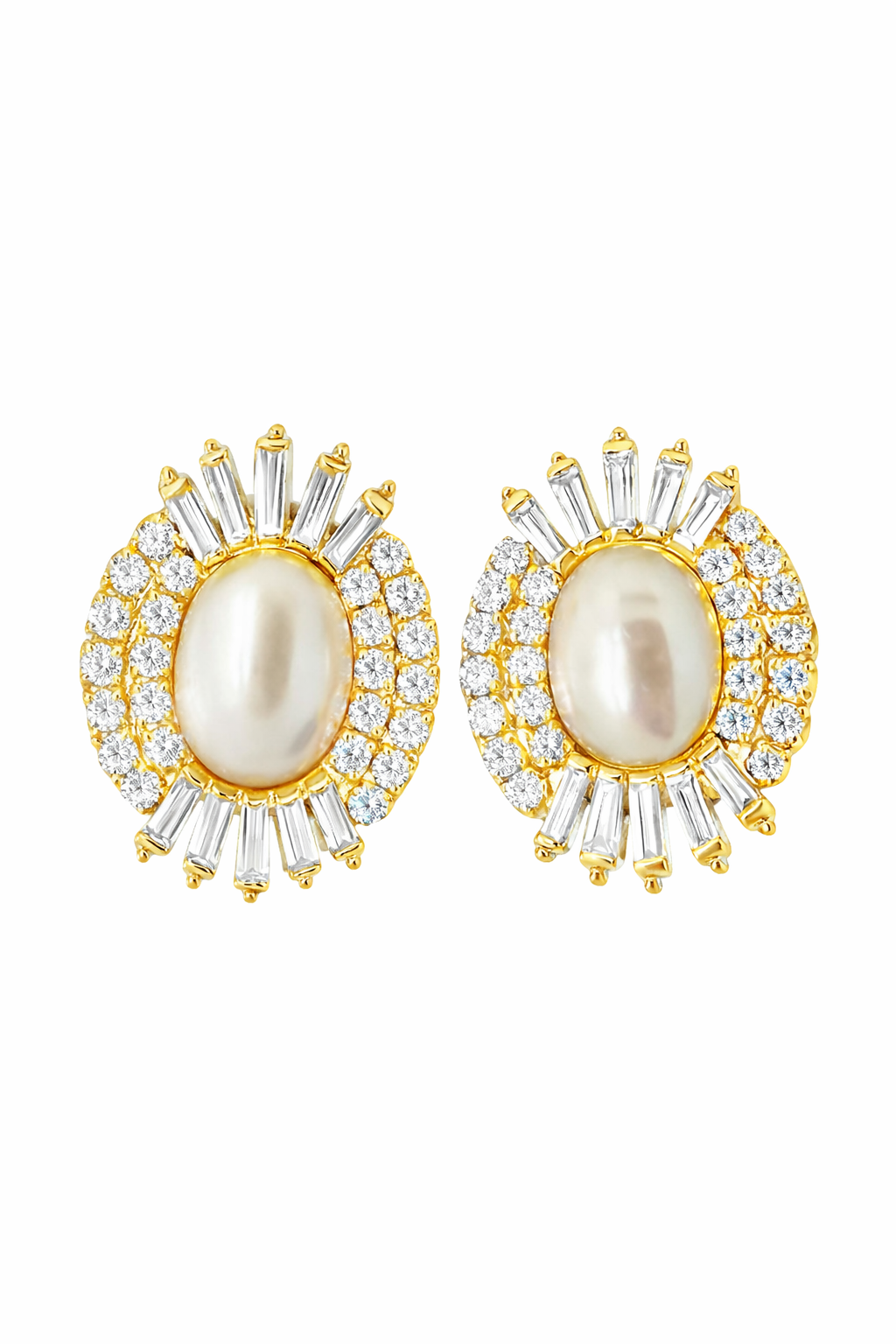 Each earring features a luminous oval pearl at its centre, beautifully framed by a halo of sparkling brilliant-cut diamonds. Baguette-cut diamonds fan out above and below the pearl, creating a radiant sunburst effect that adds depth, movement, and refined glamour. Crafted in rich 18ct yellow gold, these studs offer exceptional brilliance and enduring sophistication.