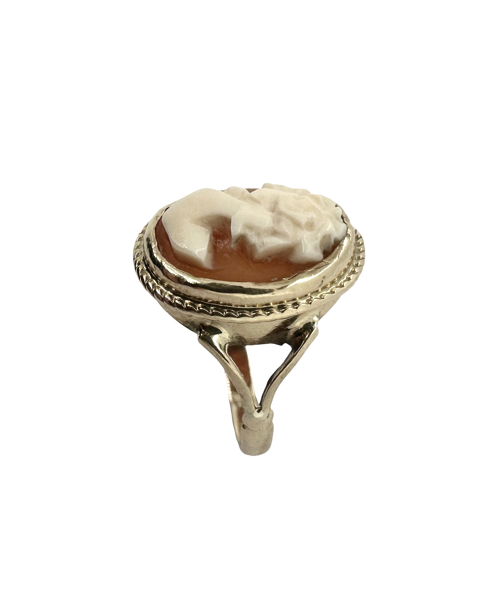 The cameo is bezel-set in polished 9ct yellow gold and framed by a delicate rope-style border, enhancing its vintage character. Openwork shoulders lead into a smooth gold band, offering both comfort and enduring style. A charming piece ideal for collectors or lovers of classic jewellery.