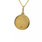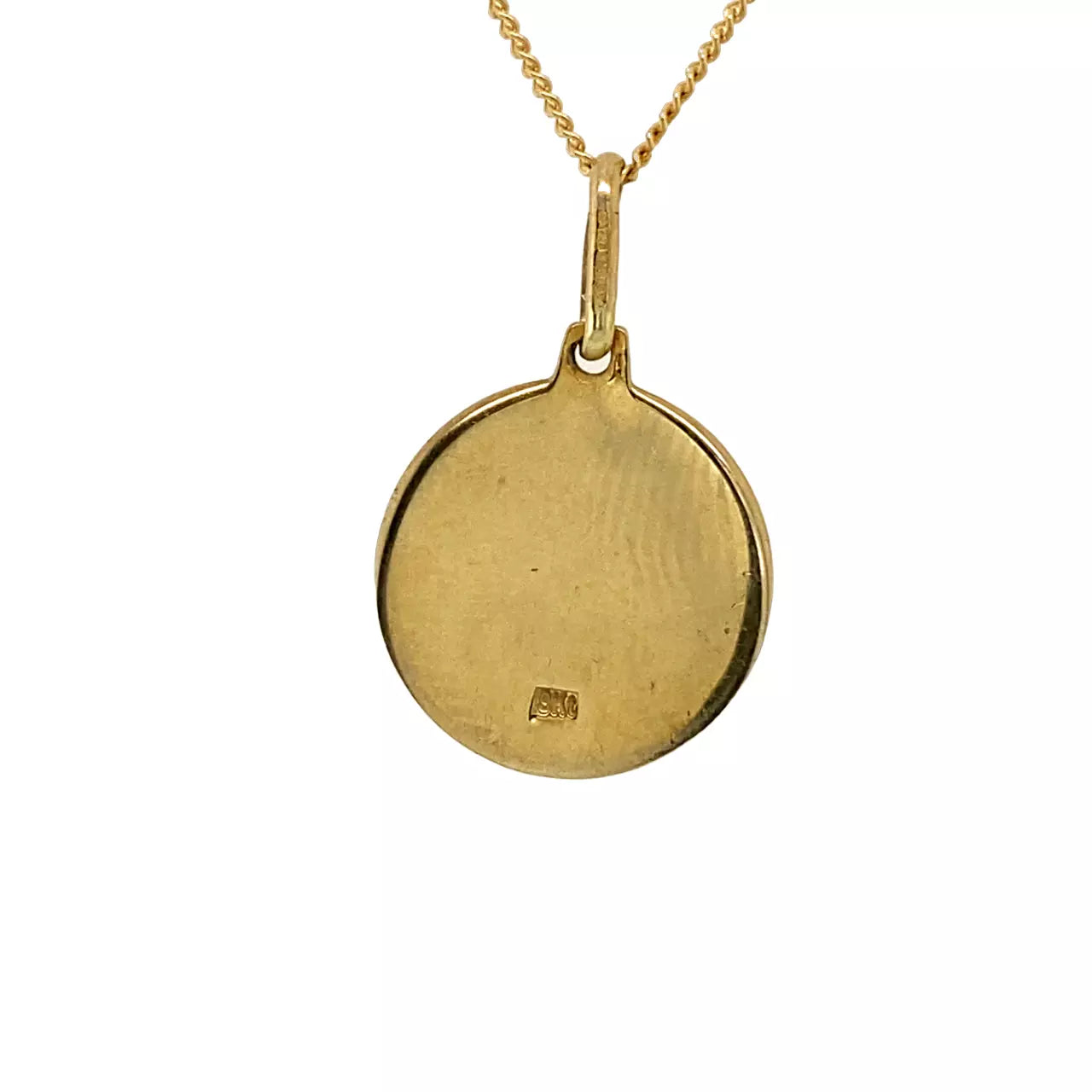 The pendant measures 15mm in diameter with a 1mm thickness, offering a refined yet eye-catching look. It is suspended from a classic 18" (46cm) yellow gold fine curb chain, secured with a bolt ring clasp for everyday comfort and reliability. The reverse of the pendant is plain and clearly hallmarked “9KT”, confirming its gold purity.