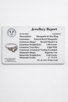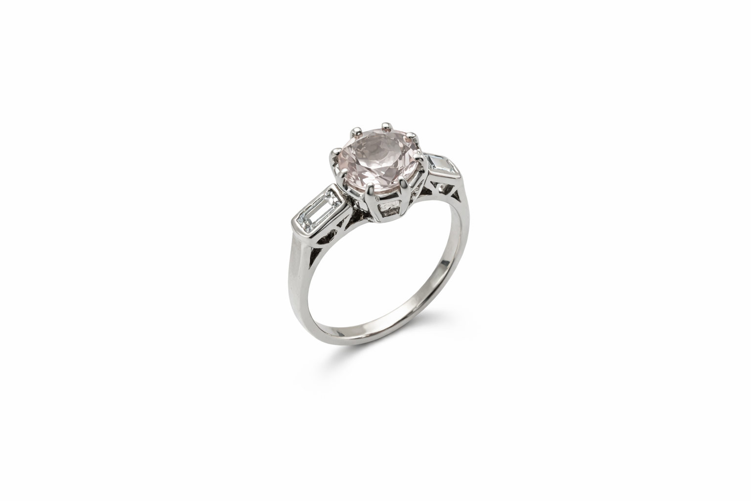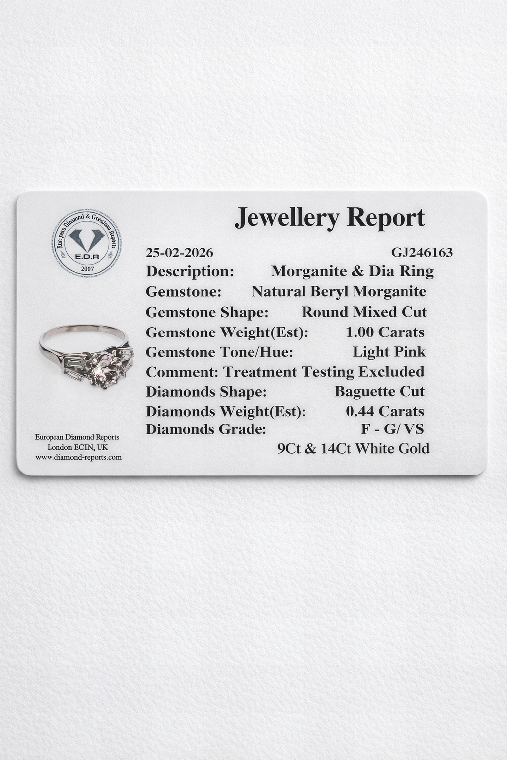 Framing the centre stone are four baguette-cut diamonds, two on each side, creating a balanced and structured silhouette. Each diamond weighs 0.11ct, giving a total diamond weight of 0.44ct, adding crisp sparkle that perfectly complements the subtle warmth of the morganite.