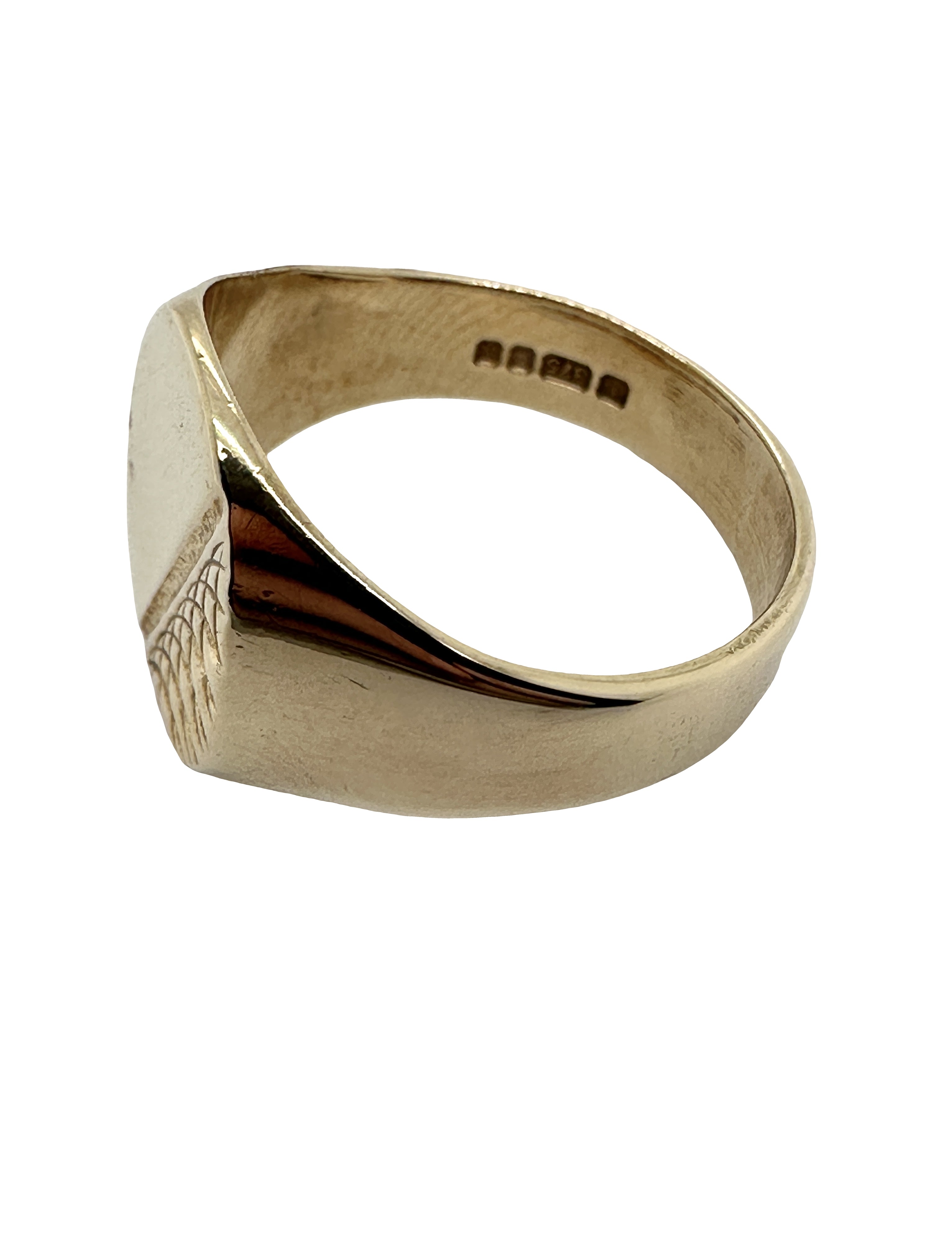The oval head features a half-patterned design, offering a touch of intricate texture while leaving space for optional engraving. The remainder of the ring is expertly polished to a high shine, showcasing the rich warmth of 9ct yellow gold. A timeless piece that pairs effortlessly with both formal and everyday wear.