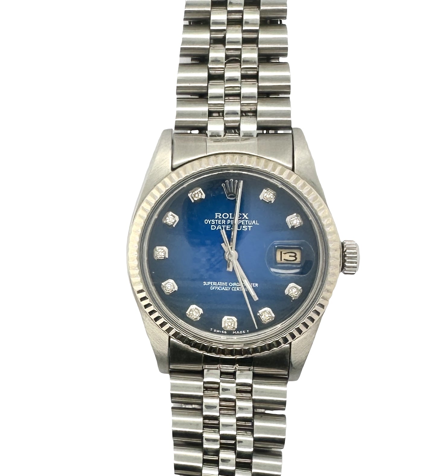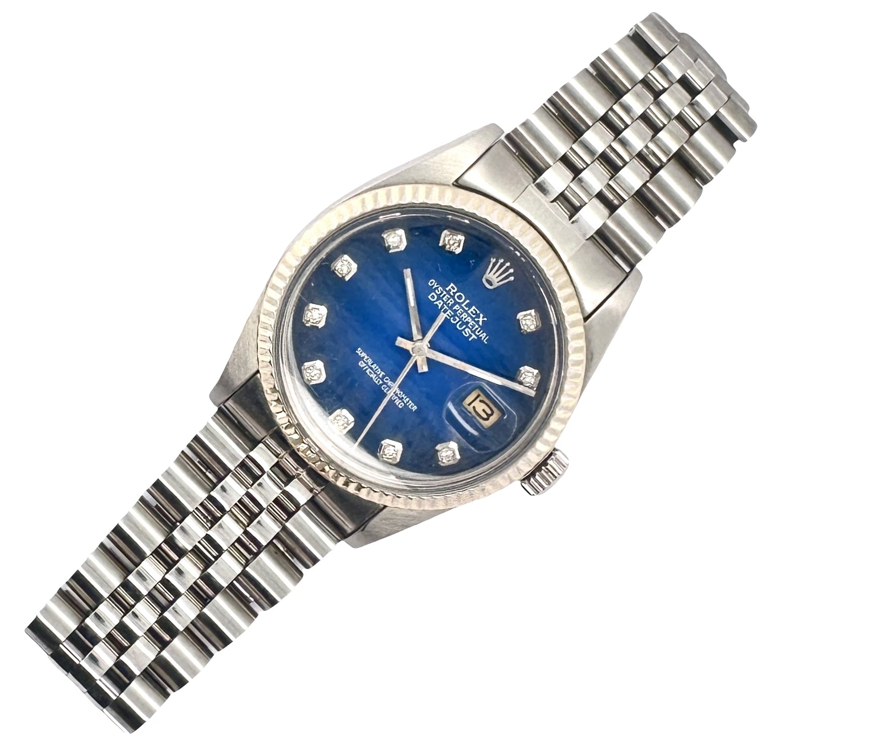 A superb vintage Rolex Datejust from 1984, featuring a stainless-steel case, white gold fluted bezel, and a stylish Jubilee bracelet. The standout aftermarket blue diamond dial adds a modern touch to this classic design.