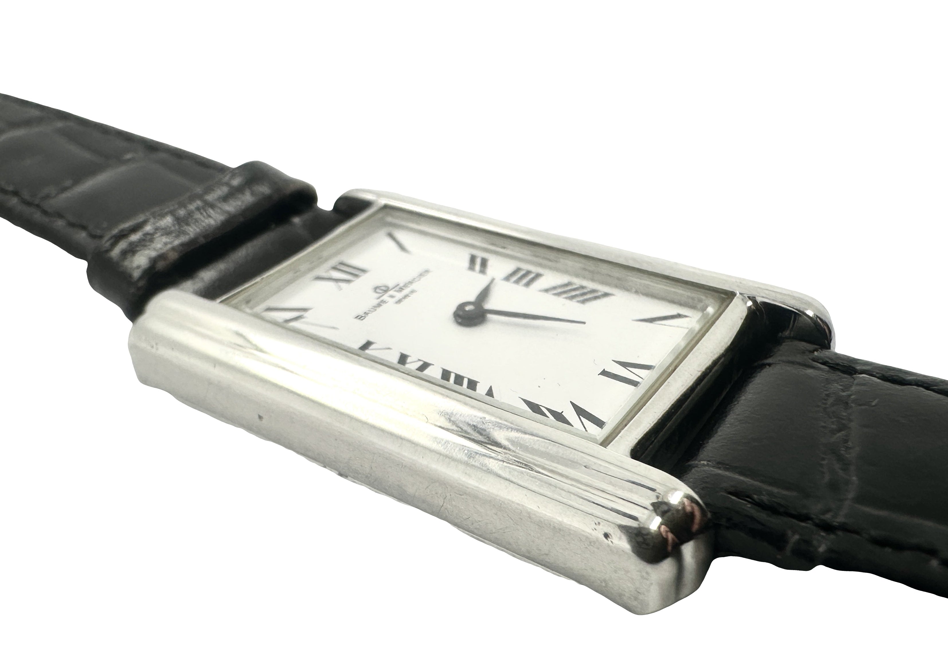 The white dial is beautifully contrasted by black Roman numerals and refined black hands, offering a crisp and legible display. The design captures the understated luxury for which Baume & Mercier is renowned.