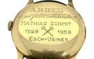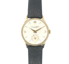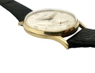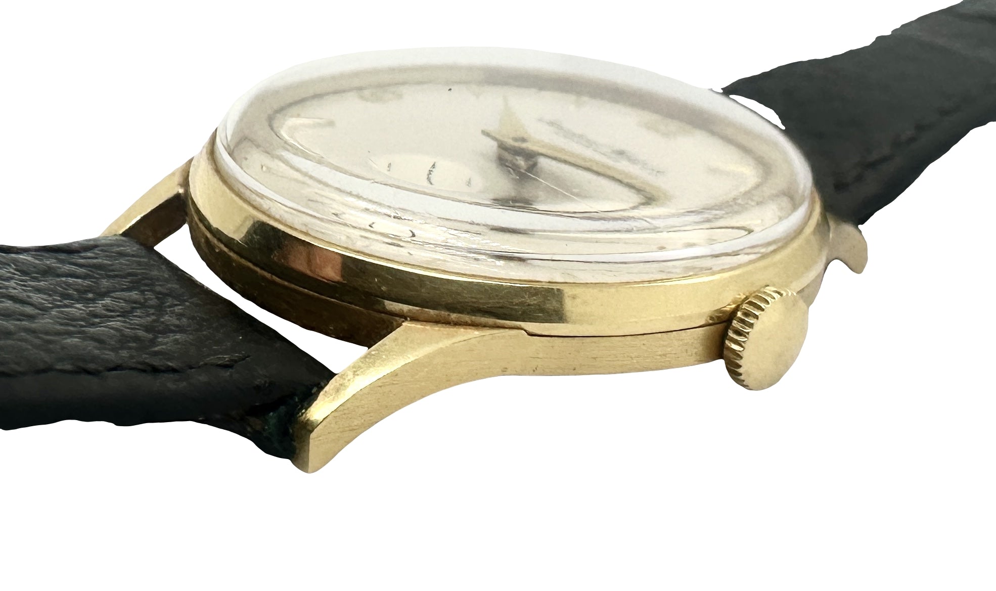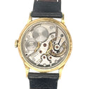 The watch is fitted with a black leather strap (not original) and presents beautifully on the wrist, ideal for collectors or those seeking a classic gold dress watch.