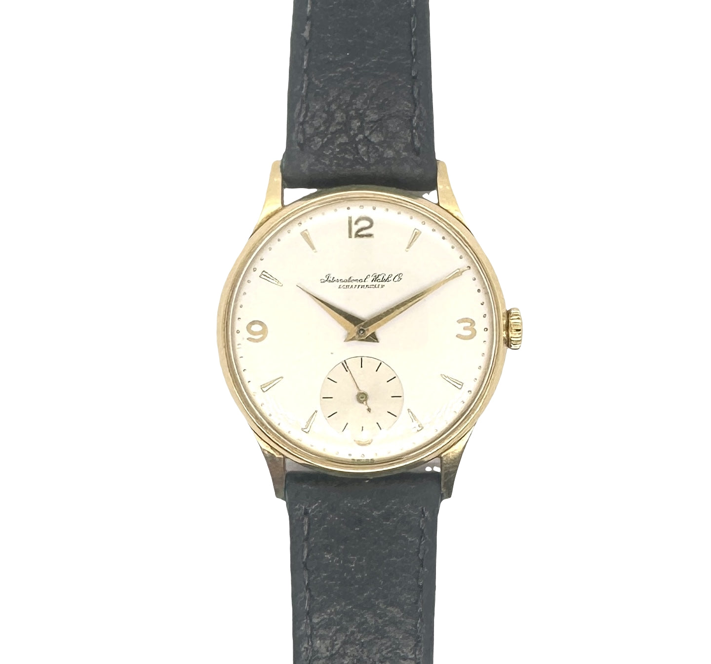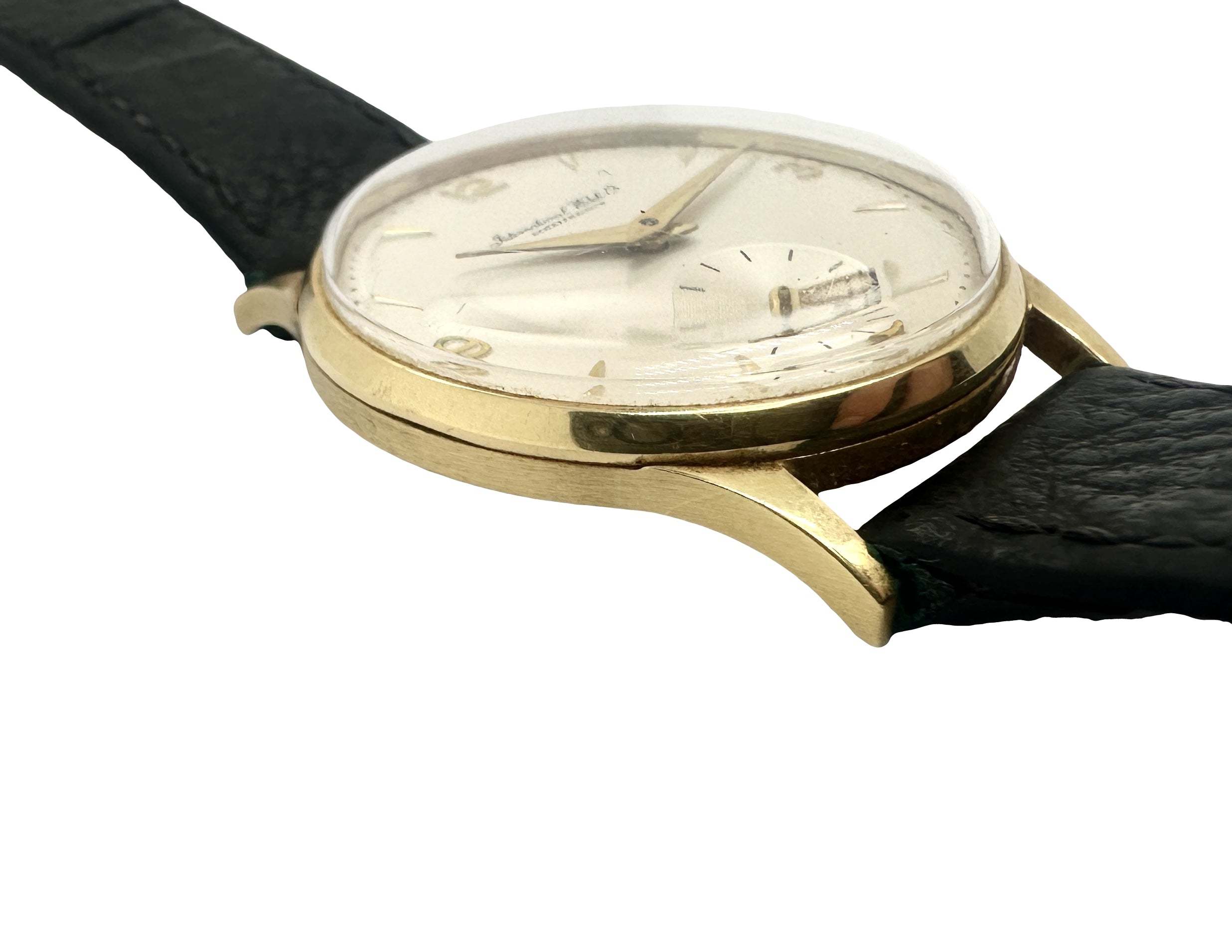 The clean silver dial features applied gold Arabic numerals and baton markers, elegant dauphine hands, and a subsidiary seconds dial at 6 o’clock. Housed in a solid 18ct yellow gold case, the watch is powered by the highly regarded IWC Calibre 105 mechanical movement, visible through the opened case back images and admired for its reliability and craftsmanship.