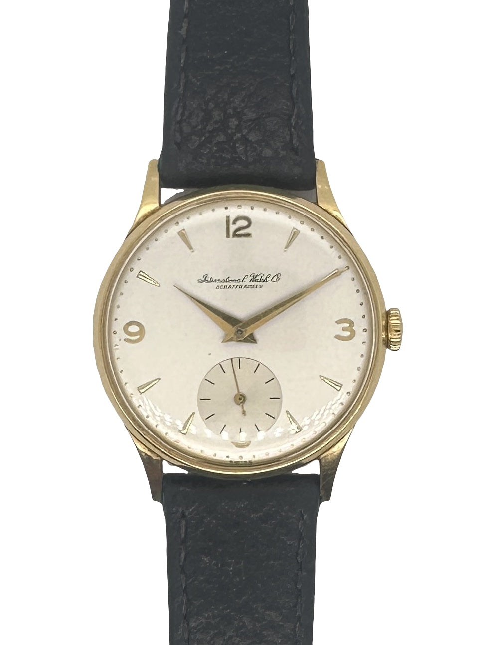 A refined example of mid-20th-century Swiss watchmaking, this 32mm IWC 18ct yellow gold mechanical wristwatch showcases the brand’s timeless design and horological excellence.