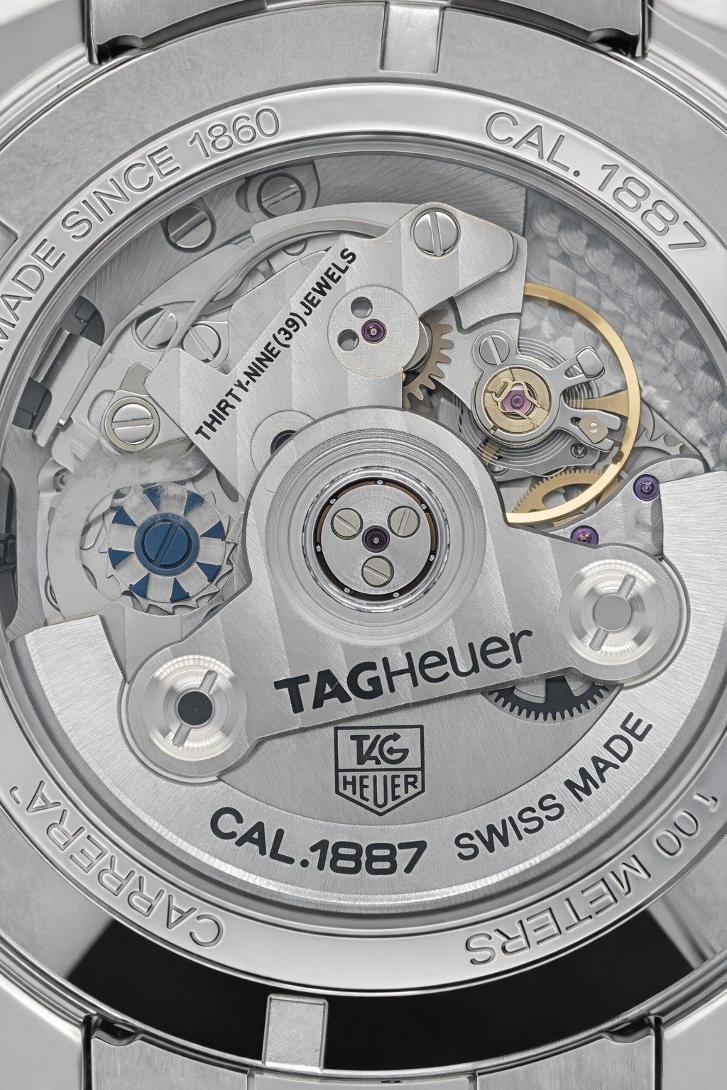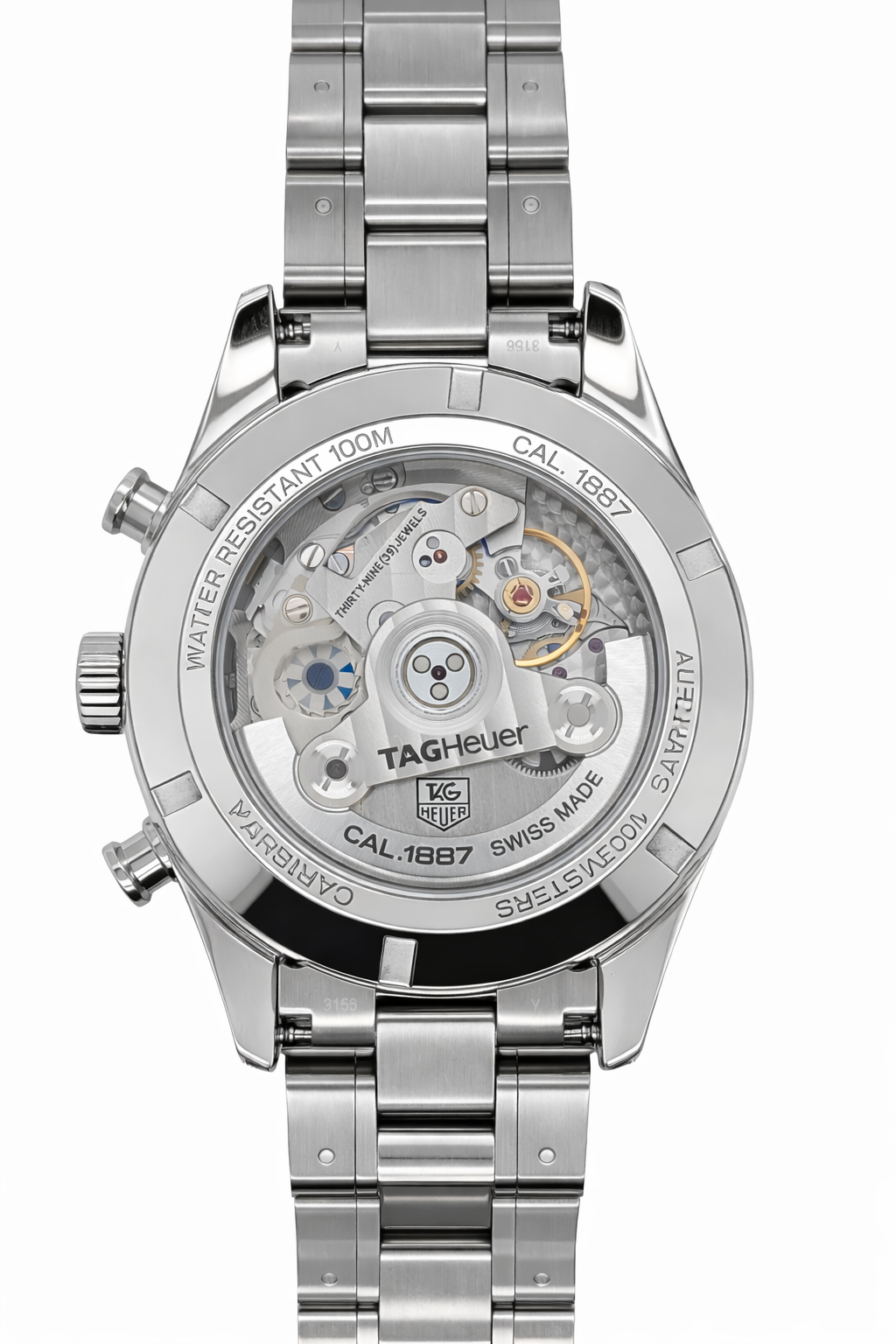 This watch features a sapphire crystal with anti-reflective coating and a transparent case back. The watch is powered by the Calibre 1887 automatic movement, known for its precision, durability, and smooth chronograph action.