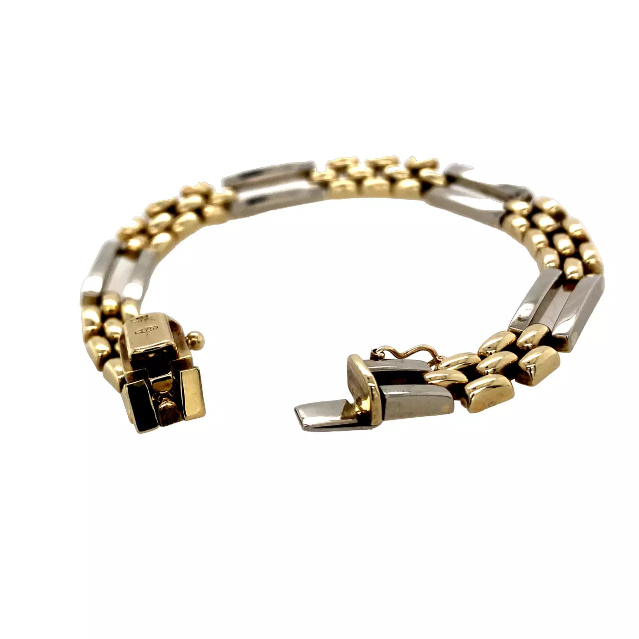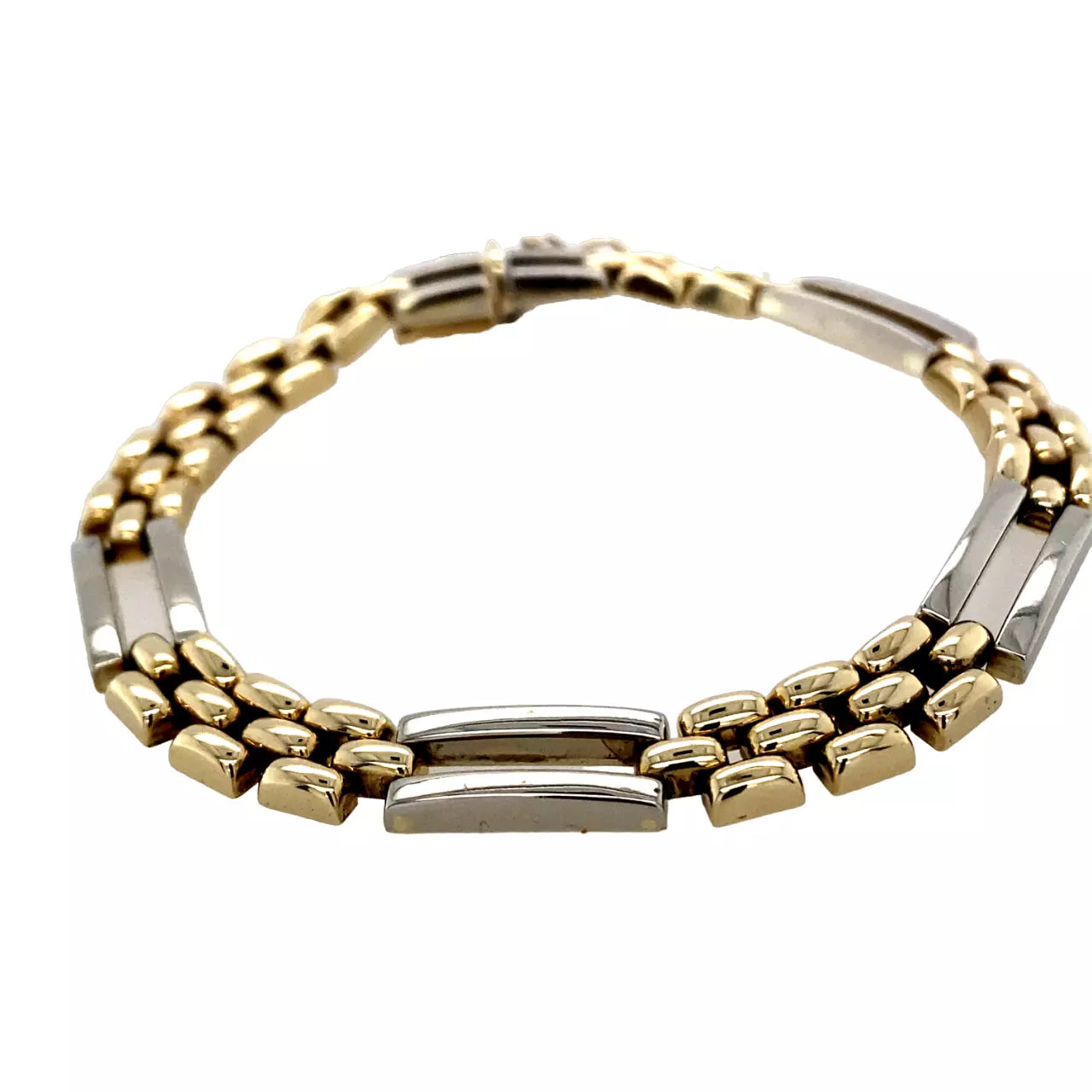9ct yellow and white Gold fancy bracelet. The design consists of white Gold bars and a three row yellow Gold beaded links in between. The clasp is hallmarked indicating it to be 9ct Gold. The width of the links are 7mm with a thickness of 3mm. The length of the bracelet is 19cm.