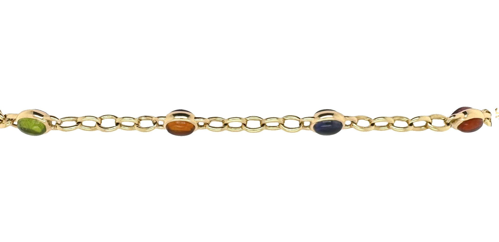 The bracelet features a harmonious arrangement of eight cabochon-cut gemstones, each bezel-set in rich 18ct gold. The thoughtfully curated selection includes two peridots, two tourmalines, one sapphire, one amethyst, one amber, and one citrine – all chosen for their vivid natural hues and refined finish. Each gemstone measures approximately 7x5mm to 9x5mm, with a smooth cabochon polish that enhances their depth, texture, and lustre, adding soft organic elegance to the overall look.